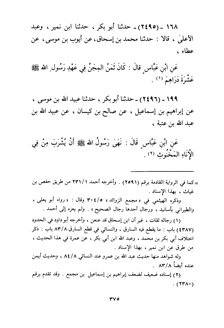 2496 - حَدَّثَنَا أَبُو بَكْرٍ، حَدَّثَنَا عُبَيْدُ اللَّهِ بْنُ مُوسَى، عَنْ إِبْرَاهِيمَ بْنِ إِسْمَاعِيلَ، عَنْ صَالِحِ بْنِ كَيْسَانَ، عَنْ عُبَيْدِ اللَّهِ بْنِ عَبْدِ اللَّهِ بْنِ عُتْبَةَ، عَنِ ابْنِ عَبَّاسٍ قَالَ: «§نَهَى رَسُولُ اللَّهِ صَلَّى اللهُ عَلَيْهِ وَسَلَّمَ أَنْ يُشْرَبَ مِنْ فِي الْإِنَاءِ الْمَخْنُوثِ» Kإسناده ضعيف
