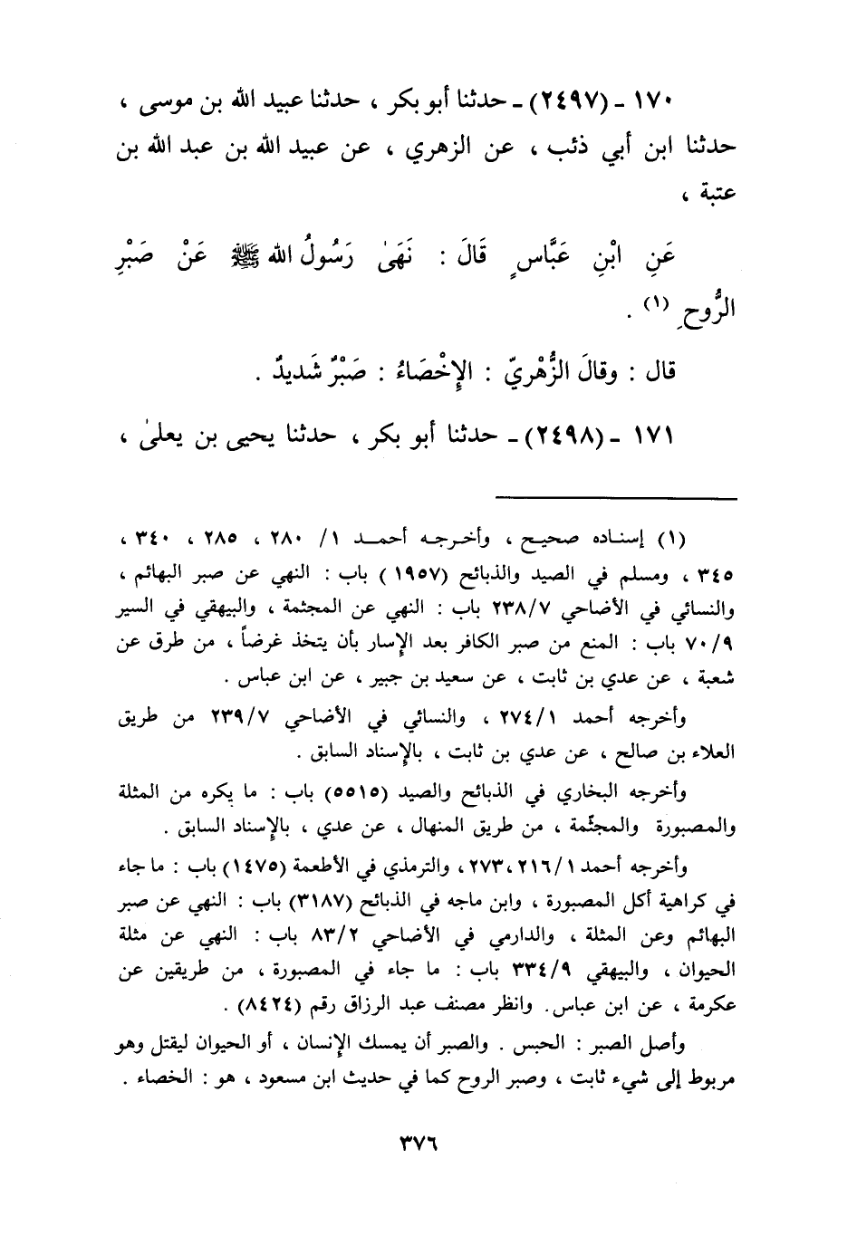 2497 - حَدَّثَنَا أَبُو بَكْرٍ، حَدَّثَنَا عُبَيْدُ اللَّهِ بْنُ مُوسَى، حَدَّثَنَا ابْنُ أَبِي ذِئْبٍ، عَنِ الزُّهْرِيِّ، عَنْ عُبَيْدِ اللَّهِ بْنِ عَبْدِ اللَّهِ بْنِ عُتْبَةَ، عَنِ ابْنِ عَبَّاسٍ قَالَ: «§نَهَى رَسُولُ اللَّهِ صَلَّى اللهُ عَلَيْهِ وَسَلَّمَ عَنْ صَبْرِ الرُّوحِ» قَالَ: وَقَالَ الزُّهْرِيُّ: الْإِخْصَاءُ: صَبْرٌ شَدِيدٌKإسناده صحيح