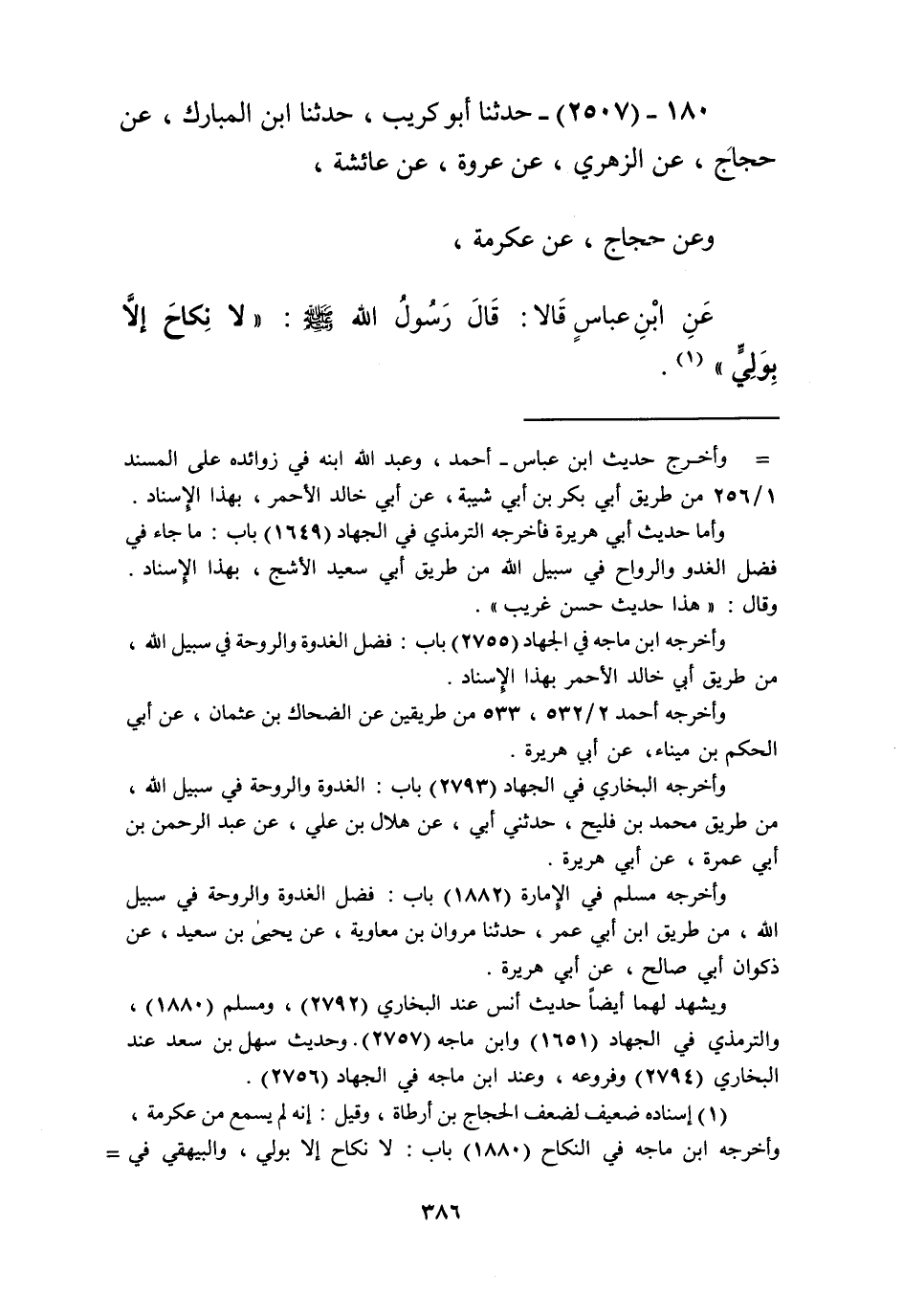 2507 - حَدَّثَنَا أَبُو كُرَيْبٍ، حَدَّثَنَا ابْنُ الْمُبَارَكِ، عَنْ حَجَّاجٍ، عَنِ الزُّهْرِيِّ، عَنْ عُرْوَةَ، عَنْ عَائِشَةَ، وَعَنْ حَجَّاجٍ، عَنْ عِكْرِمَةَ، عَنِ ابْنِ عَبَّاسٍ قَالَا: قَالَ رَسُولُ اللَّهِ صَلَّى اللهُ عَلَيْهِ وَسَلَّمَ: «§لَا نِكَاحَ إِلَّا بِوَلِيٍّ» Kإسناده ضعيف