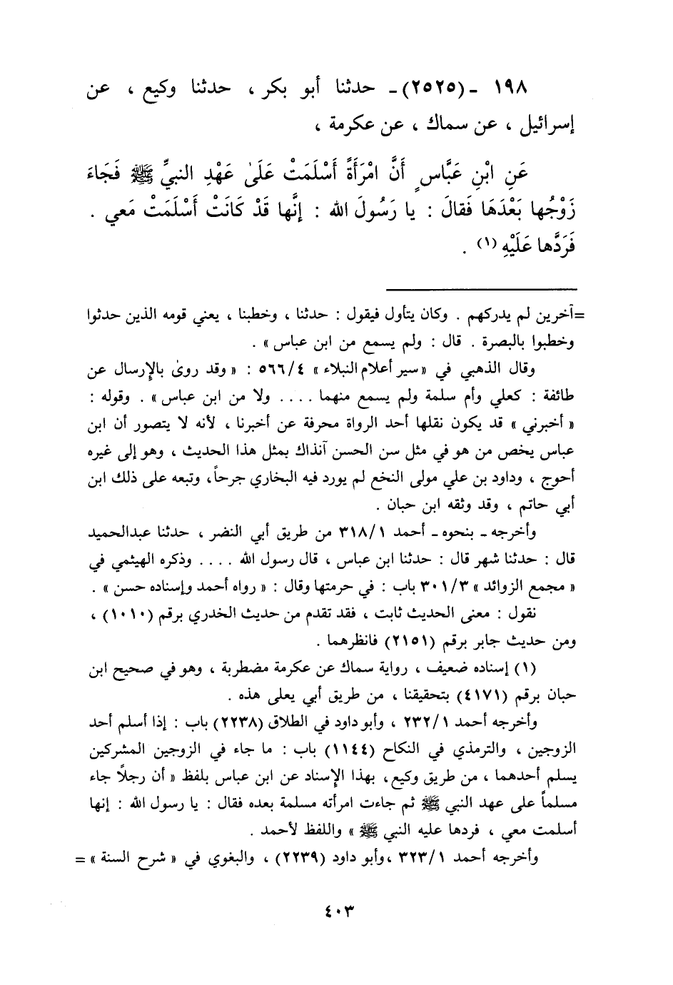 2525 - حَدَّثَنَا أَبُو بَكْرٍ، حَدَّثَنَا وَكِيعٌ، عَنْ إِسْرَائِيلَ، عَنْ سِمَاكٍ، عَنْ عِكْرِمَةَ، عَنِ ابْنِ عَبَّاسٍ أَنَّ " §امْرَأَةً أَسْلَمَتْ عَلَى عَهْدِ النَّبِيِّ صَلَّى اللهُ عَلَيْهِ وَسَلَّمَ، فَجَاءَ زَوْجُهَا بَعْدَهَا فَقَالَ: يَا رَسُولَ اللَّهِ إِنَّهَا قَدْ كَانَتْ أَسْلَمَتْ مَعِي. فَرَدَّهَا عَلَيْهِ "Kإسناده ضعيف