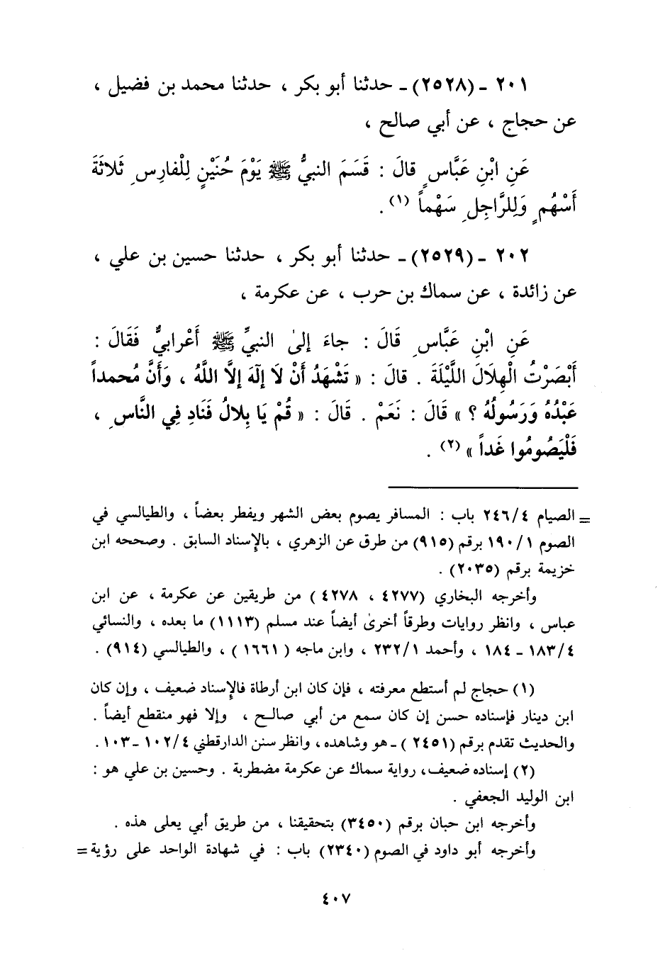 2529 - حَدَّثَنَا أَبُو بَكْرٍ، حَدَّثَنَا حُسَيْنُ بْنُ عَلِيٍّ، عَنْ زَائِدَةَ، عَنْ سِمَاكِ بْنِ حَرْبٍ، عَنْ عِكْرِمَةَ، عَنِ ابْنِ عَبَّاسٍ قَالَ: " §جَاءَ إِلَى النَّبِيِّ صَلَّى اللهُ عَلَيْهِ وَسَلَّمَ أَعْرَابِيٌّ فَقَالَ: أَبْصَرْتُ الْهِلَالَ اللَّيْلَةَ. قَالَ: «تَشَهَّدُ أَنَّ لَا إِلَهَ إِلَّا اللَّهُ وَأَنَّ مُحَمَّدًا عَبْدُهُ وَرَسُولُهُ؟» قَالَ: نَعَمْ. قَالَ: «قُمْ يَا بِلَالُ فَنَادِ فِي النَّاسِ فَلْيَصُومُوا غَدًا» Kإسناده ضعيف