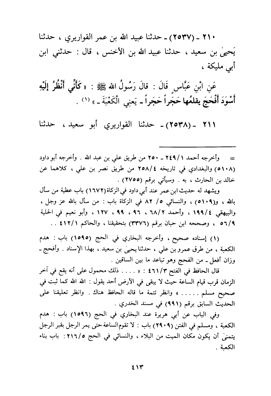 2537 - حَدَّثَنَا عُبَيْدُ اللَّهِ بْنُ عُمَرَ الْقَوَارِيرِيُّ، حَدَّثَنَا يَحْيَى بْنُ سَعِيدٍ، حَدَّثَنَا عُبَيْدُ اللَّهِ بْنُ الْأَخْنَسِ قَالَ: حَدَّثَنِي ابْنُ أَبِي مُلَيْكَةَ، عَنِ ابْنِ عَبَّاسٍ قَالَ: قَالَ رَسُولُ اللَّهِ صَلَّى اللهُ عَلَيْهِ وَسَلَّمَ: «§كَأَنِّي أَنْظُرُ إِلَيْهِ أَسْوَدَ أَفْحَجَ يَقْلَعُهَا حَجَرًا حَجَرًا - يَعْنِي الْكَعْبَةَ -» Kإسناده صحيح