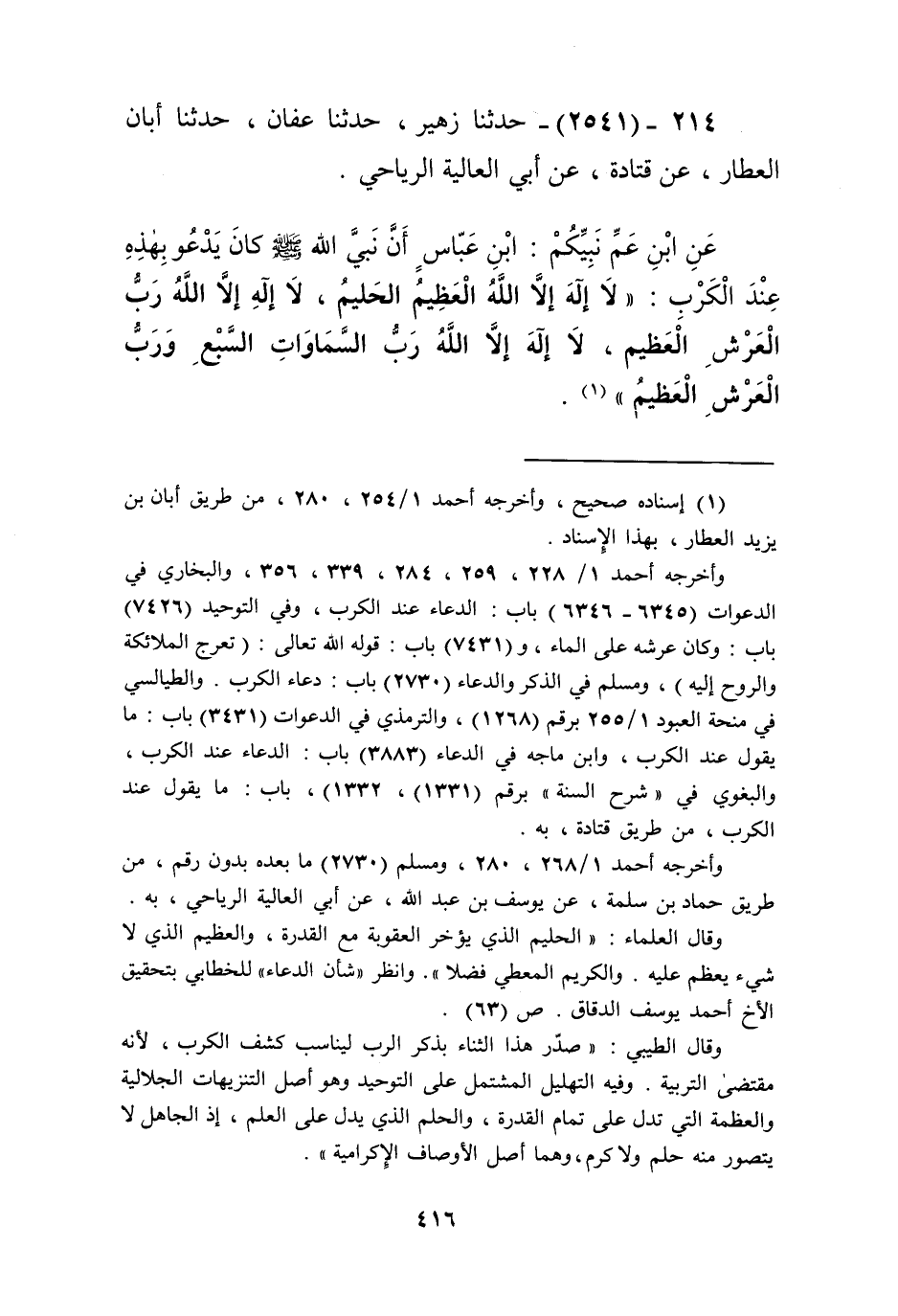 2541 - حَدَّثَنَا زُهَيْرٌ، حَدَّثَنَا عَفَّانُ، حَدَّثَنَا أَبَانُ الْعَطَّارُ، عَنْ قَتَادَةَ، عَنْ أَبِي الْعَالِيَةِ الرِّيَاحِيِّ، عَنِ ابْنِ عَمِّ نَبِيِّكُمْ ابْنِ عَبَّاسٍ أَنَّ نَبِيَّ اللَّهِ صَلَّى اللهُ عَلَيْهِ وَسَلَّمَ كَانَ " §يُدْعَوْ بِهَذِهِ عِنْدَ الْكَرْبِ: «لَا إِلَهَ إِلَّا اللَّهُ الْعَظِيمُ الْحَلِيمُ، لَا إِلَهَ إِلَّا اللَّهُ رَبُّ الْعَرْشِ الْعَظِيمِ، لَا إِلَهَ إِلَّا اللَّهُ رَبُّ السَّمَاوَاتِ السَّبْعِ وَرَبُّ الْعَرْشِ الْعَظِيمِ» Kإسناده صحيح