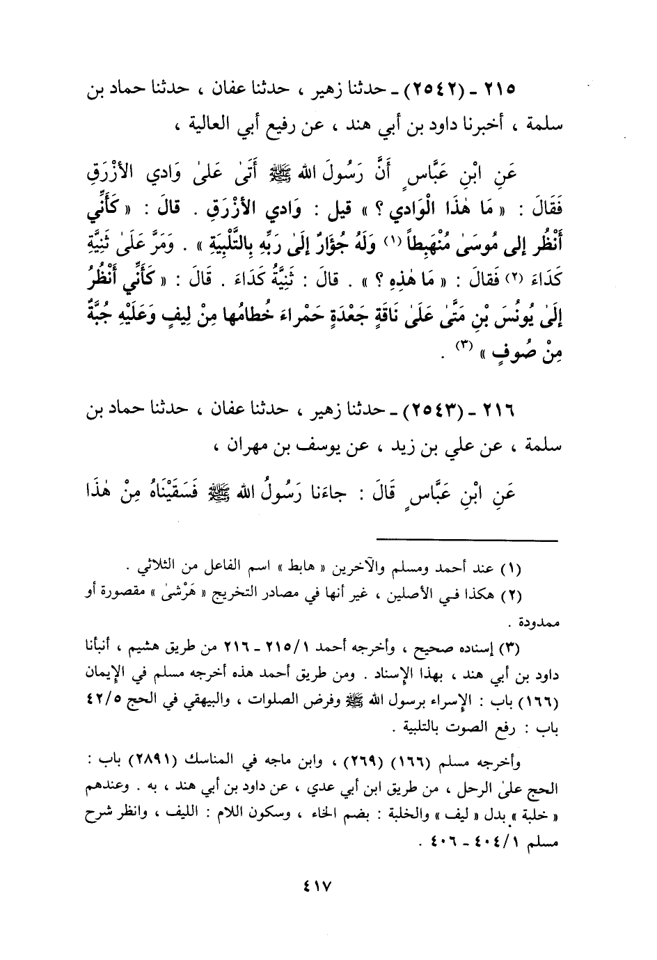 2542 - حَدَّثَنَا زُهَيْرٌ، حَدَّثَنَا عَفَّانُ، حَدَّثَنَا حَمَّادُ بْنُ سَلَمَةَ، أَخْبَرَنَا دَاوُدُ بْنُ أَبِي هِنْدَ، عَنْ رُفَيْعٍ أَبِي الْعَالِيَةِ، عَنِ ابْنِ عَبَّاسٍ أَنَّ رَسُولَ اللَّهِ صَلَّى اللهُ عَلَيْهِ وَسَلَّمَ " §أَتَى عَلَى وَادِي الْأَزْرَقِ فَقَالَ: «مَا هَذَا الْوَادِي؟» قِيلَ: وَادِي الْأَزْرَقِ قَالَ: «كَأَنِّي أَنْظُرُ إِلَى مُوسَى مُنْهَبِطًا وَلَهُ جُؤَارٌ إِلَى رَبِّهِ بِالتَّلْبِيَةِ». وَمَرَّ عَلَى ثَنِيَّةِ كَدَاءَ فَقَالَ: «مَا هَذِهِ؟» قَالَ: ثَنِيَّةُ كَدَاءَ. قَالَ: «كَأَنِّي أَنْظُرُ إِلَى يُونُسَ بْنِ مَتَّى عَلَى نَاقَةٍ جَعْدَةٍ حَمْرَاءَ خُطَامُهَا مِنْ لِيفٍ وَعَلَيْهِ جُبَّةٌ مِنْ صُوفٍ» Kإسناده صحيح