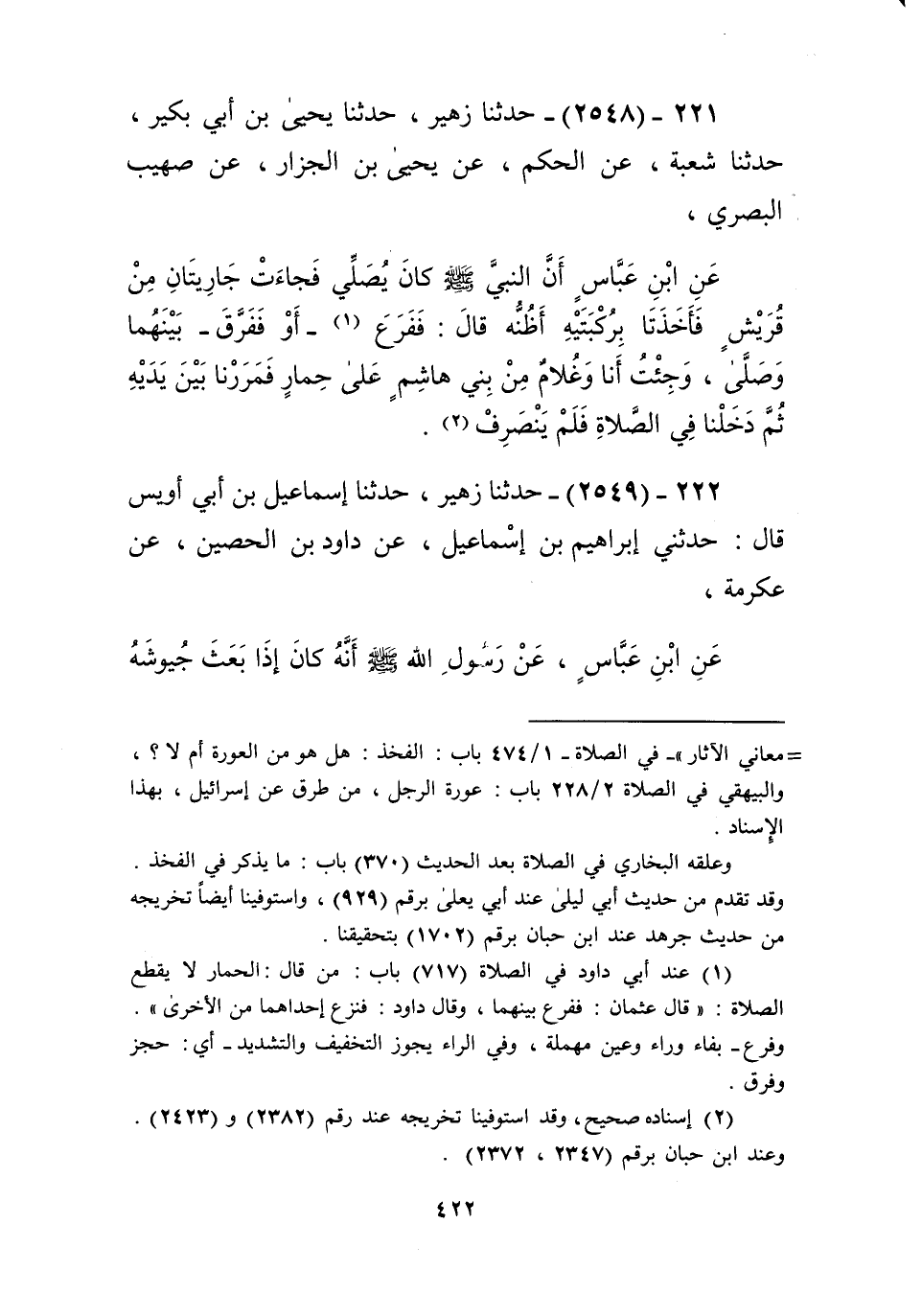 2548 - حَدَّثَنَا زُهَيْرٌ، حَدَّثَنَا يَحْيَى بْنُ أَبِي بُكَيْرٍ، حَدَّثَنَا شُعْبَةُ، عَنِ الْحَكَمِ، عَنْ يَحْيَى بْنِ الْجَزَّارِ، عَنْ صُهَيْبٍ الْبَصْرِيِّ، عَنِ ابْنِ عَبَّاسٍ أَنَّ النَّبِيَّ صَلَّى اللهُ عَلَيْهِ وَسَلَّمَ " §كَانَ يُصَلِّي فَجَاءَتْ جَارِيَتَانِ مِنْ قُرَيْشٍ فَأَخَذَتَا بِرُكْبَتَيْهِ أَظُنُّهُ قَالَ: فَفَرَّعَ أَوْ فَفَرَّقَ بَيْنَهُمَا وَصَلَّى. وَجِئْتُ أَنَا وَغُلَامٌ مِنْ بَنِي هَاشِمٍ عَلَى حِمَارٍ فَمَرَرْنَا بَيْنَ يَدَيْهِ، ثُمَّ دَخَلْنَا فِي الصَّلَاةِ فَلَمْ يَنْصَرِفْ "Kإسناده صحيح