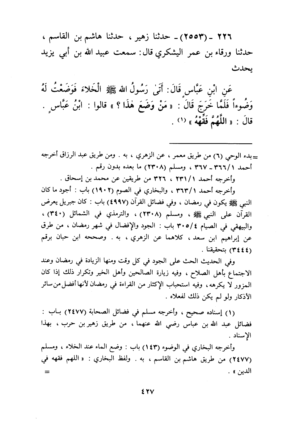 2553 - حَدَّثَنَا زُهَيْرٌ، حَدَّثَنَا هَاشِمُ بْنُ الْقَاسِمِ، حَدَّثَنَا وَرْقَاءُ بْنُ عُمَرَ الْيَشْكُرِيُّ قَالَ: سَمِعْتُ عُبَيْدَ اللَّهِ بْنِ أَبِي يَزِيدَ، يُحَدِّثُ عَنِ ابْنِ عَبَّاسٍ قَالَ: أَتَى رَسُولُ اللَّهِ صَلَّى اللهُ عَلَيْهِ وَسَلَّمَ الْخَلَاءَ فَوَضَعْتُ لَهُ وُضُوءًا، فَلَمَّا خَرَجَ قَالَ: «مَنْ وَضَعَ هَذَا؟» قَالُوا: ابْنُ عَبَّاسٍ. قَالَ: «§اللَّهُمَّ فَقِّهْهُ» Kإسناده صحيح