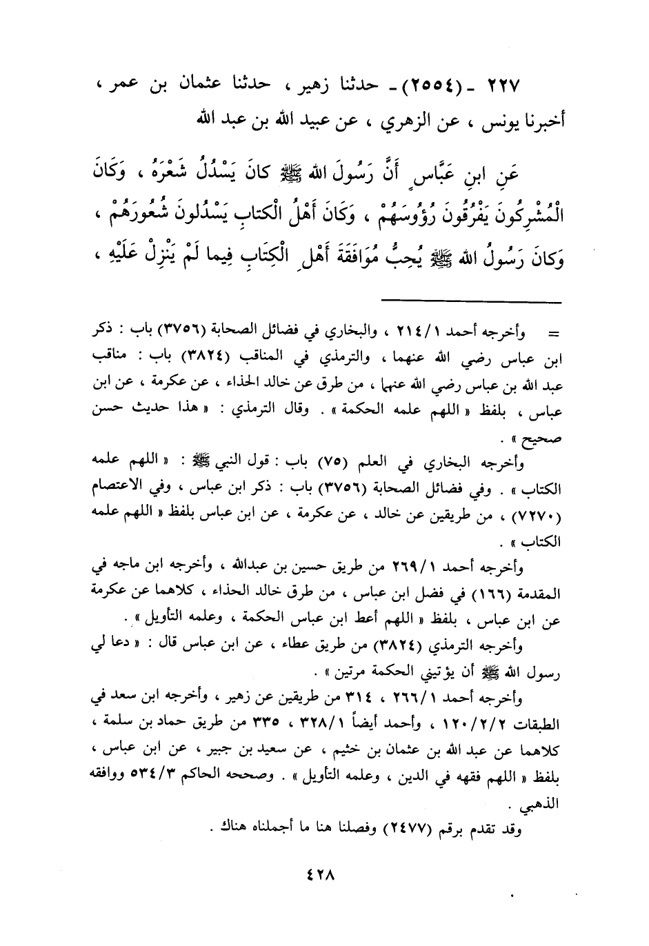 2554 - حَدَّثَنَا زُهَيْرٌ، حَدَّثَنَا عُثْمَانُ بْنُ عُمَرَ، أَخْبَرَنَا يُونُسُ، عَنِ الزُّهْرِيِّ، عَنْ عُبَيْدِ اللَّهِ بْنِ عَبْدِ اللَّهِ، عَنِ ابْنِ عَبَّاسٍ أَنَّ رَسُولَ اللَّهِ صَلَّى اللهُ عَلَيْهِ وَسَلَّمَ «§كَانَ يَسْدِلُ شَعْرَهُ، وَكَانَ الْمُشْرِكُونَ يَفْرُقُونَ رُءُوسَهُمْ، وَكَانَ أَهْلُ الْكِتَابِ يَسْدِلُونَ شُعُورَهُمْ، وَكَانَ رَسُولُ اللَّهِ صَلَّى اللهُ عَلَيْهِ وَسَلَّمَ يُحِبُّ مُوَافَقَةَ أَهْلِ الْكِتَابِ فِيمَا لَمْ يَنْزِلْ عَلَيْهِ فَفَرَقَ رَسُولُ اللَّهِ صَلَّى اللهُ عَلَيْهِ وَسَلَّمَ رَأْسَهُ» Kإسناده صحيح