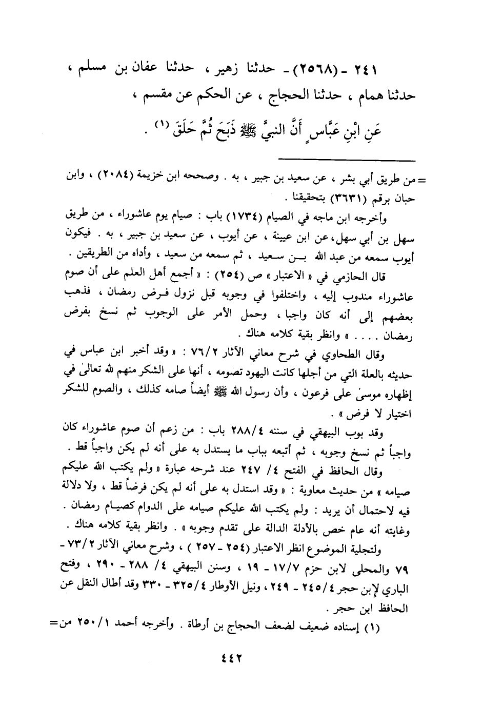 2568 - حَدَّثَنَا زُهَيْرٌ، حَدَّثَنَا عَفَّانُ بْنُ مُسْلِمٍ، حَدَّثَنَا هَمَّامٌ، حَدَّثَنَا الْحَجَّاجُ، عَنِ الْحَكَمِ، عَنْ مِقْسَمٍ، عَنِ ابْنِ عَبَّاسٍ أَنَّ النَّبِيَّ صَلَّى اللهُ عَلَيْهِ وَسَلَّمَ «§ذَبَحَ ثُمَّ حَلَقَ» Kإسناده ضعيف