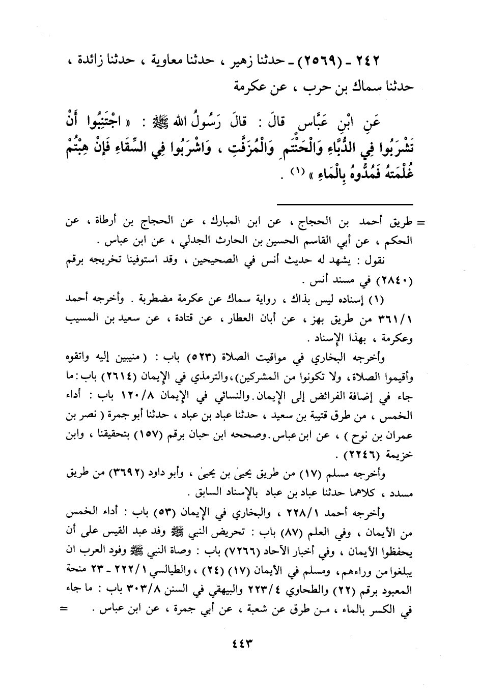 2569 - حَدَّثَنَا زُهَيْرٌ، حَدَّثَنَا مُعَاوِيَةُ، حَدَّثَنَا زَائِدَةُ، حَدَّثَنَا سِمَاكُ بْنُ حَرْبٍ، عَنْ عِكْرِمَةَ، عَنِ ابْنِ عَبَّاسٍ قَالَ: قَالَ رَسُولُ اللَّهِ صَلَّى اللهُ عَلَيْهِ وَسَلَّمَ: «§اجْتَنِبُوا أَنْ تَشْرَبُوا فِي الدُّبَّاءِ وَالْحَنْتَمِ وَالْمُزَفَّتِ وَاشْرَبُوا فِي السِّقَاءِ، فَإِنْ هِبْتُمْ غِلْمَتَهُ فَمُدُّوهُ بِالْمَاءِ» Kإسناده ليس بذاك