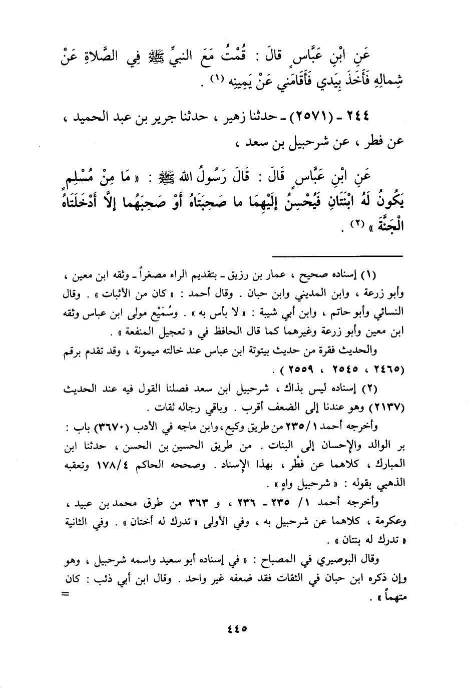 2571 - حَدَّثَنَا زُهَيْرٌ، حَدَّثَنَا جَرِيرُ بْنُ عَبْدِ الْحَمِيدِ، عَنْ فِطْرٍ، عَنْ شُرَحْبِيلَ بْنِ سَعْدٍ، عَنِ ابْنِ عَبَّاسٍ قَالَ: قَالَ رَسُولُ اللَّهِ صَلَّى اللهُ عَلَيْهِ وَسَلَّمَ: «§مَا مِنْ مُسْلِمٍ يَكُونُ لَهُ ابْنَتَانِ فَيُحْسِنُ إِلَيْهِمَا مَا صَحِبَتَاهُ أَوْ صَحِبَهُمَا إِلَّا أَدْخَلَتَاهُ الْجَنَّةَ» Kإسناده ليس بذاك