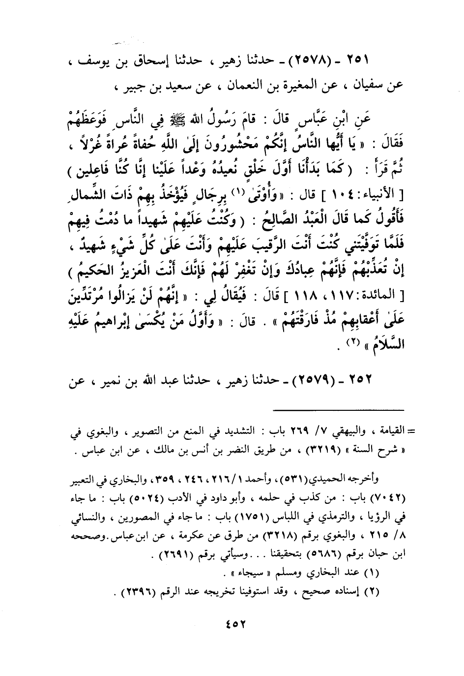 2578 - حَدَّثَنَا زُهَيْرٌ، حَدَّثَنَا إِسْحَاقُ بْنُ يُوسُفَ، عَنْ سُفْيَانَ، عَنِ الْمُغِيرَةِ بْنِ النُّعْمَانِ، عَنْ سَعِيدِ بْنِ جُبَيْرٍ، عَنِ ابْنِ عَبَّاسٍ قَالَ: قَامَ رَسُولُ اللَّهِ صَلَّى اللهُ عَلَيْهِ وَسَلَّمَ فِي النَّاسِ فَوَعَظَهُمْ فَقَالَ: " §يَا أَيُّهَا النَّاسُ إِنَّكُمْ مَحْشُورُونَ إِلَى اللَّهِ حُفَاةً عُرَاةً غُرْلًا، ثُمَّ قَرَأَ {كَمَا بَدَأْنَا أَوَّلَ خَلْقٍ نُعِيدُهُ وَعْدًا عَلَيْنَا إِنَّا كُنَّا فَاعِلِينَ} [الأنبياء: 104]. قَالَ: " وَأُوتِيَ بِرِجَالٍ فَيُؤْخَذُ بِهِمْ ذَاتَ الشِّمَالِ فَأَقُولُ كَمَا قَالَ الْعَبْدُ الصَّالِحُ {وَكُنْتُ عَلَيْهِمْ شَهِيدًا مَا دُمْتُ فِيهِمْ، فَلَمَّا تَوَفَّيْتَنِي كُنْتَ أَنْتَ الرَّقِيبَ عَلَيْهِمْ وَأَنْتَ عَلَى كُلِّ شَيْءٍ شَهِيدٌ، إِنْ تُعَذِّبْهُمْ فَإِنَّهُمْ عِبَادُكَ وَإِنْ تَغْفِرْ لَهُمْ فَإِنَّكَ أَنْتَ الْعَزِيزُ الْحَكِيمُ} [المائدة: 118] قَالَ: فَيُقَالُ لِي: «إِنَّهُمْ لَنْ يَزَالُوا مُرْتَدِّينَ عَلَى أَعْقَابِهِمْ مُذْ فَارَقْتَهُمْ». قَالَ: «وَأَوَّلُ مَنْ يُكْسَى إِبْرَاهِيمُ عَلَيْهِ السَّلَامُ» Kإسناده صحيح