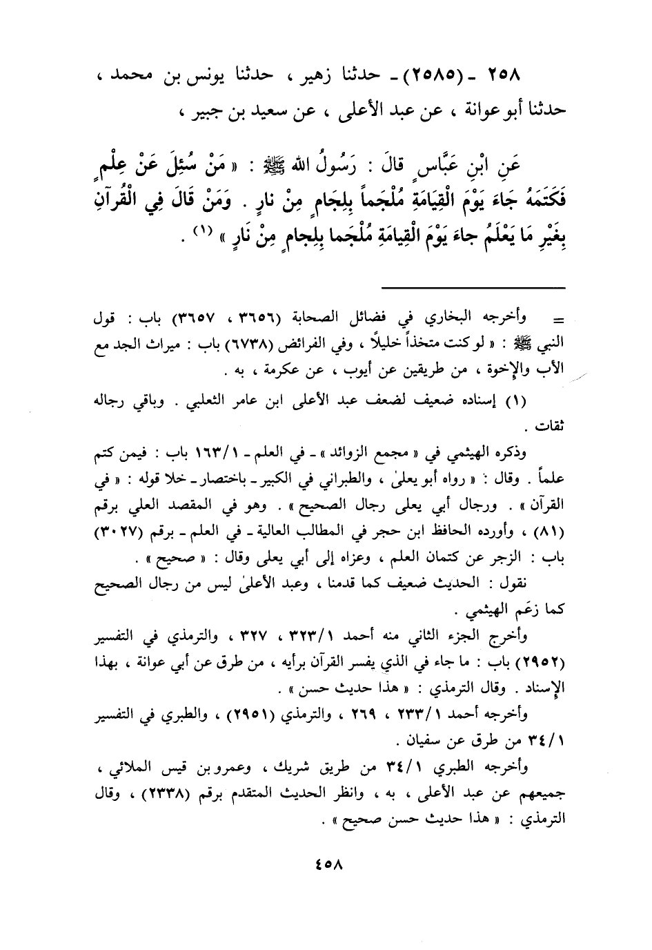 2585 - حَدَّثَنَا زُهَيْرٌ، حَدَّثَنَا يُونُسُ بْنُ مُحَمَّدٍ، حَدَّثَنَا أَبُو عَوَانَةَ، عَنْ عَبْدِ الْأَعْلَى، عَنْ سَعِيدِ بْنِ جُبَيْرٍ، عَنِ ابْنِ عَبَّاسٍ قَالَ رَسُولُ اللَّهِ صَلَّى اللهُ عَلَيْهِ وَسَلَّمَ: «§مَنْ سُئِلَ عَنْ عِلْمٍ فَكَتَمَهُ جَاءَ يَوْمَ الْقِيَامَةِ مُلْجَمًا بِلِجَامٍ مِنْ نَارٍ، وَمَنْ قَالَ فِي الْقُرْآنِ بِغَيْرِ مَا يَعْلَمْ جَاءَ يَوْمَ الْقِيَامَةِ مُلْجَمًا بِلِجَامٍ مِنْ نَارٍ» Kإسناده ضعيف
