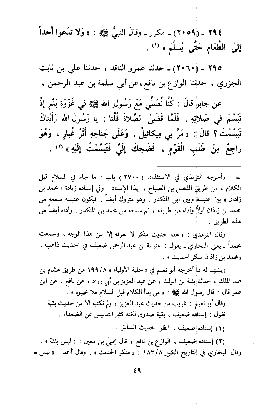 2060 - حَدَّثَنَا عَمْرٌو النَّاقِدُ، حَدَّثَنَا عَلِيُّ بْنُ ثَابِتٍ الْجَزَرِيُّ، حَدَّثَنَا الْوَازِعُ بْنُ نَافِعٍ، عَنْ أَبِي سَلَمَةَ بْنِ عَبْدِ الرَّحْمَنِ، عَنْ جَابِرٍ، قَالَ: كُنَّا نُصَلِّي مَعَ رَسُولِ اللَّهِ صَلَّى اللهُ عَلَيْهِ وَسَلَّمَ فِي غَزْوَةِ بَدْرٍ إِذْ تَبَسَّمَ فِي صَلَاتِهِ، فَلَمَّا قَضَى الصَّلَاةَ قُلْنَا: يَا رَسُولَ اللَّهِ رَأَيْنَاكَ تَبَسَّمْتَ؟ قَالَ: «§مَرَّ بِي مِيكَائِيلُ وَعَلَى جَنَاحِهِ أَثَرُ غُبَارٍ وَهُوَ رَاجِعٌ مِنْ طَلَبِ الْقَوْمِ، فَضَحِكَ إِلَيَّ فَتَبَسَّمْتُ إِلَيْهِ» Kإسناده ضعيف