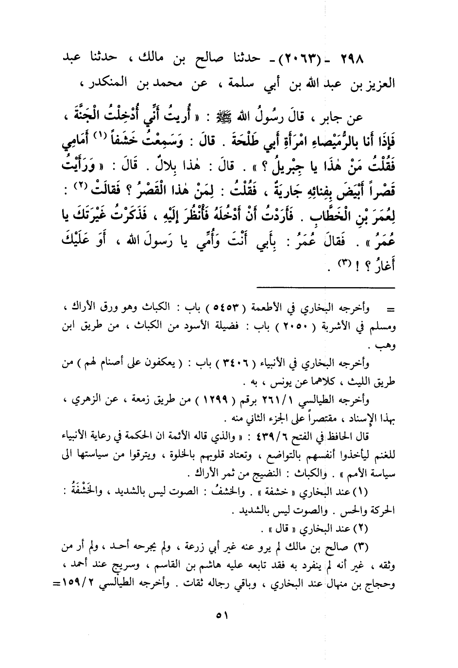 2063 - حَدَّثَنَا صَالِحُ بْنُ مَالِكٍ، حَدَّثَنَا عَبْدُ الْعَزِيزِ بْنُ عَبْدِ اللَّهِ بْنِ أَبِي سَلَمَةَ، عَنْ مُحَمَّدِ بْنِ الْمُنْكَدِرِ، عَنْ جَابِرٍ، قَالَ رَسُولُ اللَّهِ صَلَّى اللهُ عَلَيْهِ وَسَلَّمَ: «§أُرِيتُ أَنِّي أُدْخِلَتُ الْجَنَّةَ، فَإِذَا أَنَا بِالرُّمَيْصَاءِ امْرَأَةِ أَبِي طَلْحَةَ»، قَالَ: «وَسَمِعْتُ خَشَفًا أَمَامِي» فَقُلْتُ: «مَنْ هَذَا يَا جِبْرِيلُ؟» قَالَ: هَذَا بِلَالٌ، قَالَ: وَرَأَيْتُ قَصْرًا أَبْيَضَ بِفِنَائِهِ جَارِيَةٌ، فَقُلْتُ: «لِمَنْ هَذَا الْقَصْرُ؟» فَقَالَتْ: لِعُمَرَ بْنِ الْخَطَّابِ، فَأَرَدْتُ أَنْ أَدْخُلَهُ فَأَنْظُرَ إِلَيْهِ، فَذَكَرْتُ غَيْرَتَكَ يَا عُمَرُ " فَقَالَ عُمَرُ: بِأَبِي أَنْتَ وَأُمِّي يَا رَسُولَ اللَّهِ، أَوْ عَلَيْكَ أَغَارُ؟