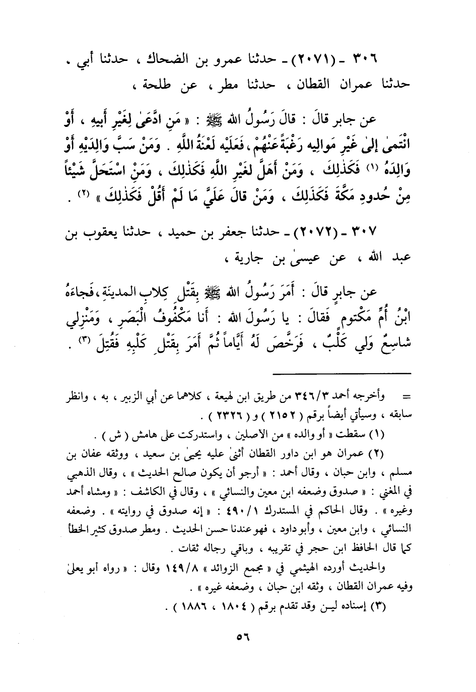 2071 - حَدَّثَنَا عَمْرُو بْنُ الضَّحَّاكِ، حَدَّثَنَا أَبِي، حَدَّثَنَا عِمْرَانُ الْقَطَّانُ، حَدَّثَنَا مَطَرُ، عَنْ طَلْحَةَ، عَنْ جَابِرٍ، قَالَ: قَالَ رَسُولُ اللَّهِ صَلَّى اللهُ عَلَيْهِ وَسَلَّمَ: «§مَنِ ادَّعَى لِغَيْرِ أَبِيهِ، أَوِ انْتَمَى إِلَى غَيْرِ مَوَالِيهِ رَغْبَةً عَنْهُمْ، فَعَلَيْهِ لَعْنَةُ اللَّهِ، وَمَنْ سَبَّ وَالِدَيْهِ أَوْ وَالِدَهُ فَكَذَلِكَ، وَمَنْ أَهَلَّ لِغَيْرِ اللَّهِ فَكَذَلِكَ، وَمَنِ اسْتَحَلَّ شَيْئًا مِنْ حُدُودِ مَكَّةَ فَكَذَلِكَ، وَمَنْ قَالَ عَلَيَّ مَا لَمْ أَقُلْ فَكَذَلِكَ»
