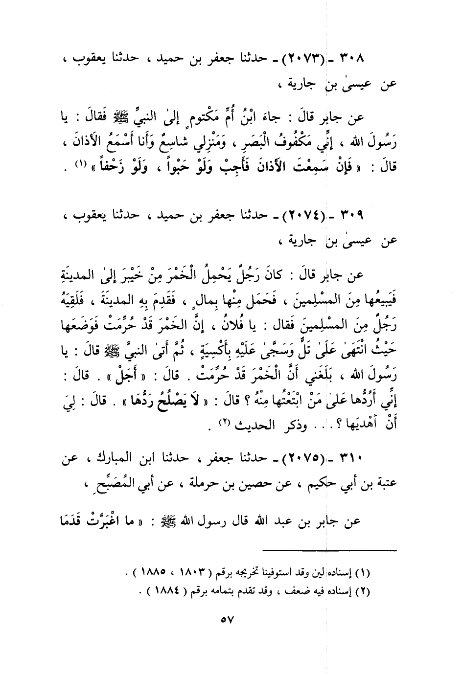 2074 - حَدَّثَنَا جَعْفَرُ بْنُ حُمَيْدٍ، حَدَّثَنَا يَعْقُوبُ، عَنْ عِيسَى بْنِ جَارِيَةَ، عَنْ جَابِرٍ، قَالَ: كَانَ رَجُلٌ يَحْمِلُ الْخَمْرَ مِنْ خَيْبَرٍ إِلَى الْمَدِينَةِ فَيَبِيعَهَا مِنَ الْمُسْلِمِينَ، فَحَمَلَ مِنْهَا بِمَالٍ، فَقَدِمَ بِهِ الْمَدِينَةَ، فَلَقِيَهُ رَجُلٌ مِنَ الْمُسْلِمِينَ فَقَالَ: يَا فُلَانٌ إِنَّ الْخَمْرَ قَدْ حُرِّمَتْ فَوَضَعَهَا حَيْثُ انْتَهَى عَلَى تَلٍّ وَسَجَّى عَلَيْهِ بِأَكْسِيَةٍ، ثُمَّ أَتَى النَّبِيَّ صَلَّى اللهُ عَلَيْهِ وَسَلَّمَ قَالَ: يَا رَسُولَ اللَّهِ §بَلَغَنِي أَنَّ الْخَمْرَ قَدْ حُرِّمَتْ؟ قَالَ: «أَجَلْ» قَالَ: إِنِّي أَرُدُّهَا عَلَى مَنِ ابْتَعْتُهَا مِنْهُ؟ قَالَ: «لَا يَصْلُحُ رَدُّهَا» قَالَ: لِيَ أَنْ أَهْدِيَهَا؟. . . وَذَكَرَ الْحَدِيثَKإسناده فيه ضعف