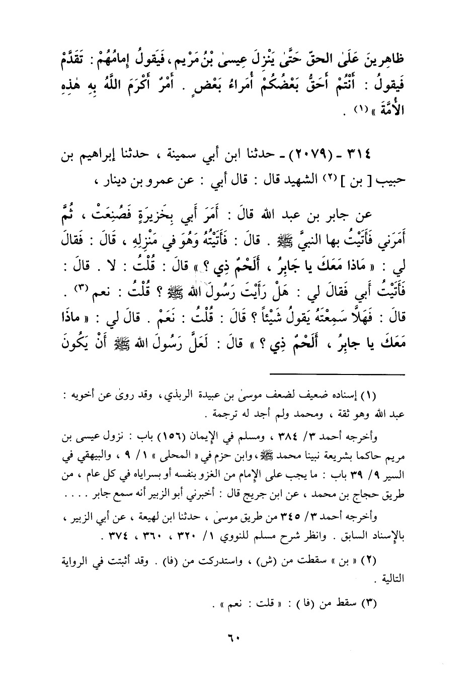 2079 - حَدَّثَنَا ابْنُ أَبِي سَمِينَةَ، حَدَّثَنَا إِبْرَاهِيمُ بْنُ حَبِيبِ بْنِ الشَّهِيدِ، قَالَ: قَالَ أَبِي، عَنْ عَمْرِو بْنِ دِينَارٍ، عَنْ جَابِرِ بْنِ عَبْدِ اللَّهِ، قَالَ: أَمَرَ أَبِي بِخَزِيرَةٍ فَصُنِعَتْ، ثُمَّ أَمَرَنِي فَأَتَيْتُ بِهَا النَّبِيَّ صَلَّى اللهُ عَلَيْهِ وَسَلَّمَ قَالَ: فَأَتَيْتُهُ وَهُوَ فِي مَنْزِلِهِ قَالَ: فَقَالَ لِي: «مَاذَا مَعَكَ يَا جَابِرُ، أَلْحَمٌ ذِي؟» قَالَ: قُلْتُ: لَا، قَالَ: فَأَتَيْتُ أَبِي، فَقَالَ لِي: هَلْ رَأَيْتَ رَسُولَ اللَّهِ صَلَّى اللهُ عَلَيْهِ وَسَلَّمَ؟ قُلْتُ: نَعَمْ، قَالَ: فَهَلَّا سَمِعْتَهُ يَقُولُ شَيْئًا: قَالَ: قُلْتُ: نَعَمْ، قَالَ لِي: «مَاذَا مَعَكَ يَا جَابِرُ، أَلْحَمٌ ذِي؟» قَالَ: لَعَلَّ رَسُولَ اللَّهِ صَلَّى اللهُ عَلَيْهِ وَسَلَّمَ أَنْ يَكُونَ اشْتَهَى، فَأَمَرَ بِشَاةٍ لَنَا دَاجِنٍ فَذُبِحَتْ، ثُمَّ أَمَرَ بِهَا فَشُوِيَتْ، ثُمَّ أَمَرَنِي فَأَتَيْتُ بِهَا النَّبِيَّ صَلَّى اللهُ عَلَيْهِ وَسَلَّمَ فَقَالَ لِي: مَاذَا مَعَكَ يَا جَابِرُ؟ " فَأَخْبَرْتُهُ، فَقَالَ: «§جَزَى اللَّهُ الْأَنْصَارَ عَنَّا خَيْرًا، وَلَا سِيَّمَا عَبْدِ اللَّهِ بْنِ عَمْرِو بْنِ حَرَامٍ، وَسَعْدِ بْنِ عُبَادَةَ»