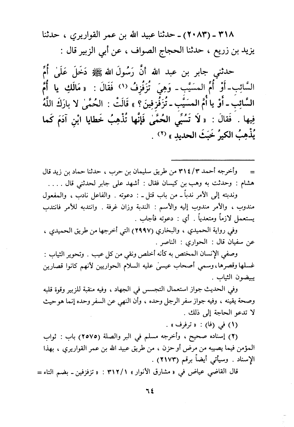 2083 - حَدَّثَنَا عُبَيْدُ اللَّهِ بْنُ عُمَرَ الْقَوَارِيرِيُّ، حَدَّثَنَا يَزِيدُ بْنُ زُرَيْعٍ، حَدَّثَنَا الْحَجَّاجُ الصَّوَّافُ، عَنْ أَبِي الزُّبَيْرِ، قَالَ: حَدَّثَنِي جَابِرُ بْنُ عَبْدِ اللَّهِ، أَنَّ رَسُولَ اللَّهِ صَلَّى اللهُ عَلَيْهِ وَسَلَّمَ دَخَلَ عَلَى أُمِّ السَّائِبِ أَوْ أُمِّ الْمُسَيَّبِ وَهِيَ تُزَفْزِفُ، فَقَالَ: «مَالَكِ يَا أُمَّ السَّائِبِ، أَوْ يَا أُمَّ الْمُسَيَّبِ تُزَفْزِفِينَ؟» قَالَتِ: الْحُمَّى لَا بَارِكَ اللَّهُ فِيهَا، فَقَالَ: «§لَا تَسُبِّي الْحُمَّى فَإِنَّهَا تُذْهِبُ خَطَايَا ابْنِ آدَمَ كَمَا يُذْهِبُ الْكِيرُ خَبَثَ الْحَدِيدِ» Kإسناده صحيح