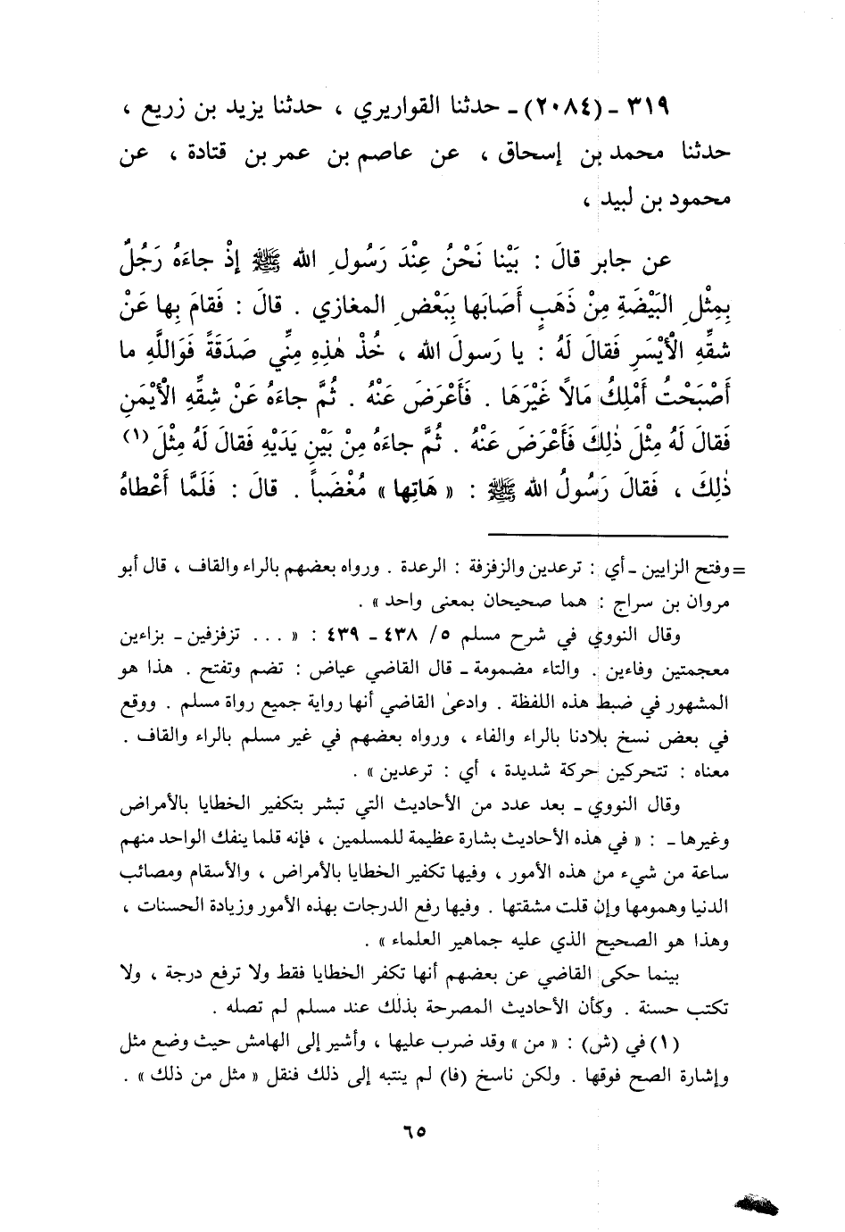 2084 - حَدَّثَنَا الْقَوَارِيرِيُّ، حَدَّثَنَا يَزِيدُ بْنُ زُرَيْعٍ، حَدَّثَنَا مُحَمَّدُ بْنُ إِسْحَاقَ، عَنْ عَاصِمِ بْنِ عُمَرَ بْنِ قَتَادَةَ، عَنْ مَحْمُودِ بْنِ لَبِيدٍ، عَنْ جَابِرٍ، قَالَ: بَيْنَا نَحْنُ عِنْدَ رَسُولِ اللَّهِ صَلَّى اللهُ عَلَيْهِ وَسَلَّمَ إِذْ جَاءَهُ رَجُلٌ بِمِثْلِ الْبَيْضَةِ مِنْ ذَهَبٍ أَصَابَهَا بِبَعْضِ الْمَغَازِي، قَالَ: فَقَامَ بِهَا عَنْ شِقِّهِ الْأَيْسَرِ فَقَالَ لَهُ: يَا رَسُولَ اللَّهِ خُذْ هَذِهِ مِنِّي صَدَقَةً، فَوَاللَّهِ مَا أَصْبَحْتُ أَمْلِكُ مَالًا غَيْرَهَا، فَأَعْرَضَ عَنْهُ، ثُمَّ جَاءَهُ عَنْ شِقِّهِ الْأَيْمَنِ، فَقَالَ لَهُ مِثْلَ ذَلِكَ، فَأَعْرَضَ عَنْهُ، ثُمَّ جَاءَهُ مِنْ بَيْنِ يَدَيْهِ، فَقَالَ لَهُ مِثْلَ ذَلِكَ، فَقَالَ رَسُولُ اللَّهِ صَلَّى اللهُ عَلَيْهِ وَسَلَّمَ: «هَاتِهَا» مُغْضَبًا. قَالَ: فَلَمَّا أَعْطَاهُ إِيَّاهَا خَذَفَهُ بِهَا لَوْ أَصَابَهُ أَوْجَعَهُ أَوْ عَقَرَهُ، ثُمَّ قَالَ: «§يَجِيءُ أَحَدُكُمْ بِمَالِهِ - أَوْ كَمَا قَالَ - لَا يَمْلِكُ غَيْرَهُ يَتَصَدَّقُ بِهِ، ثُمَّ يَقْعُدُ بَعْدَ ذَلِكَ يَتَكَفَّفُ النَّاسَ؟ إِنَّمَا الصَّدَقَةُ عَنْ ظَهْرِ غِنًى، خُذْ عَنَّا مَالَكَ لَا حَاجَةَ لَنَا بِهِ» Kرجال ثقات