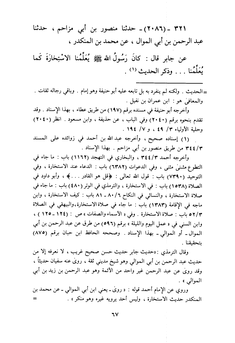 2086 - حَدَّثَنَا مَنْصُورُ بْنُ أَبِي مُزَاحِمٍ، حَدَّثَنَا عَبْدُ الرَّحْمَنِ بْنُ أَبِي الْمَوَالِ، عَنْ مُحَمَّدِ بْنِ الْمُنْكَدِرِ، عَنْ جَابِرٍ، قَالَ: «كَانَ رَسُولُ اللَّهِ صَلَّى اللهُ عَلَيْهِ وَسَلَّمَ §يُعَلِّمُنَا الِاسْتِخَارَةَ كَمَا يُعَلِّمُنَا. .» وَذَكَرَ الْحَدِيثَKإسناده صحيح