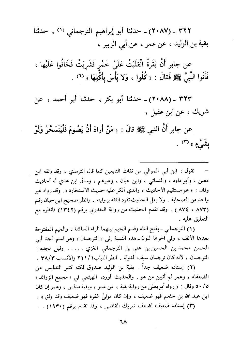 2087 - حَدَّثَنَا أَبُو إِبْرَاهِيمَ التَّرْجُمَانِيُّ، حَدَّثَنَا بَقِيَّةُ بْنُ الْوَلِيدِ، عَنْ عُمَرَ، عَنْ أَبِي الزُّبَيْرِ، عَنْ جَابِرٍ، أَنَّ بَقَرَةً، انْقَلَبَتْ عَلَى خَمْرٍ فَشَرِبَتْ، فَخَافُوا عَلَيْهَا، فَأَتَوُا النَّبِيَّ صَلَّى اللهُ عَلَيْهِ وَسَلَّمَ فَقَالَ: «§كُلُوا وَلَا بَأْسَ بِأَكْلِهَا» Kإسناده ضعيف جدا