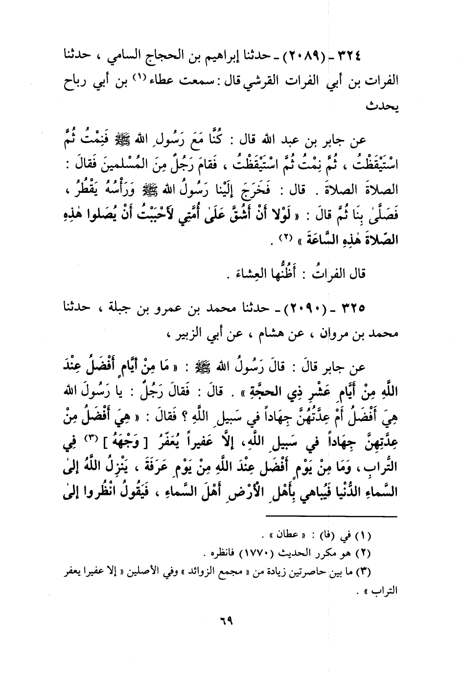 2089 - حَدَّثَنَا إِبْرَاهِيمُ بْنُ الْحَجَّاجِ السَّامِيُّ، حَدَّثَنَا الْفُرَاتُ بْنُ أَبِي الْفُرَاتِ الْقُرَشِيُّ، قَالَ: سَمِعْتُ عَطَاءَ بْنَ أَبِي رَبَاحٍ، يُحَدِّثُ عَنْ جَابِرِ بْنِ عَبْدِ اللَّهِ، قَالَ: كُنَّا مَعَ رَسُولِ اللَّهِ صَلَّى اللهُ عَلَيْهِ وَسَلَّمَ فَنِمْتُ ثُمَّ اسْتَيْقَظْتُ، ثُمَّ نِمْتُ ثُمَّ اسْتَيْقَظْتُ، فَقَامَ رَجُلٌ مِنَ الْمُسْلِمِينَ فَقَالَ: الصَّلَاةَ الصَّلَاةَ. قَالَ: فَخَرَجَ إِلَيْنَا رَسُولُ اللَّهِ صَلَّى اللهُ عَلَيْهِ وَسَلَّمَ وَرَأْسُهُ يَقْطُرُ، فَصَلَّى بِنَا، ثُمَّ قَالَ: «§لَوْلَا أَنْ أَشُقَّ عَلَى أُمَّتِي لَأَحْبَبْتُ أَنْ يُصَلُّوا هَذِهِ الصَّلَاةَ هَذِهِ السَّاعَةَ» قَالَ الْفُرَاتُ: أَظُنُّهَا الْعِشَاءَ