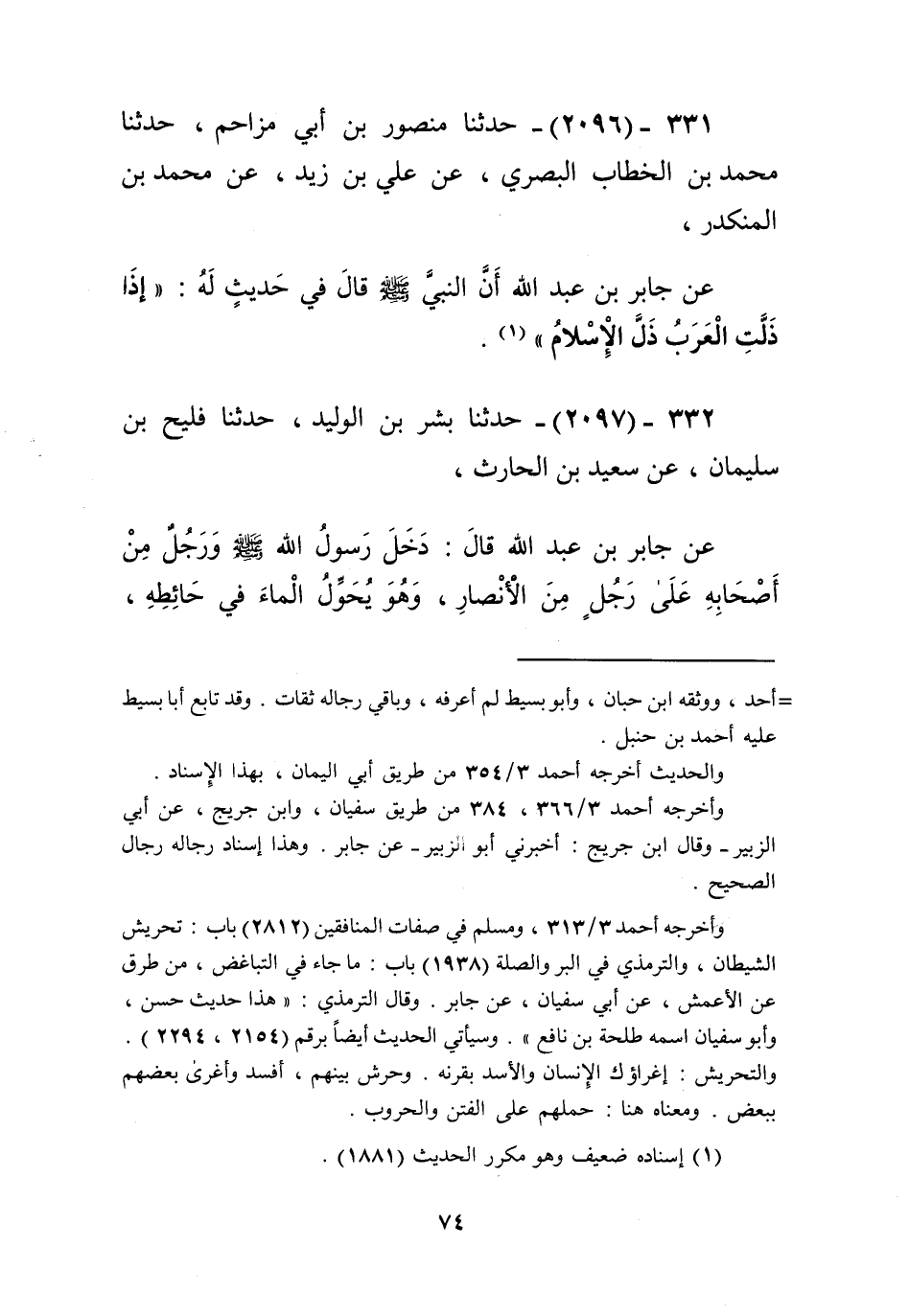 2096 - حَدَّثَنَا مَنْصُورُ بْنُ أَبِي مُزَاحِمٍ، حَدَّثَنَا مُحَمَّدُ بْنُ الْخَطَّابِ الْبَصْرِيُّ، عَنْ عَلِيِّ بْنِ زَيْدٍ، عَنْ مُحَمَّدِ بْنِ الْمُنْكَدِرِ، عَنْ جَابِرِ بْنِ عَبْدِ اللَّهِ، أَنَّ النَّبِيَّ صَلَّى اللهُ عَلَيْهِ وَسَلَّمَ قَالَ فِي حَدِيثٍ لَهُ: «§إِذَا ذَلَّتِ الْعَرَبُ ذَلَّ الْإِسْلَامُ» Kإسناده ضعيف