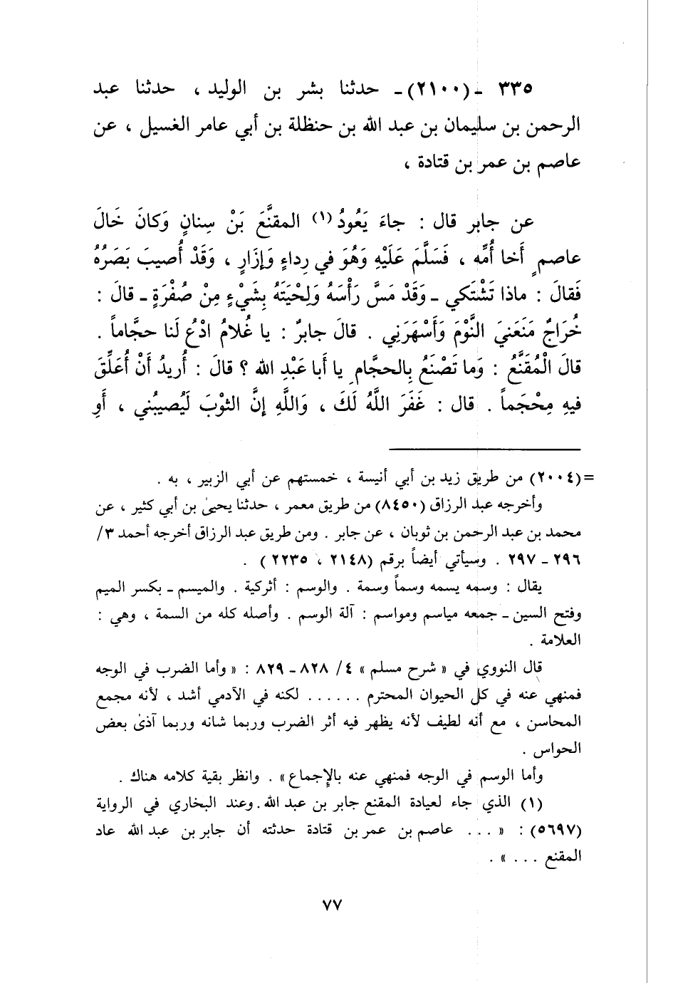 2100 - حَدَّثَنَا بِشْرُ بْنُ الْوَلِيدِ، حَدَّثَنَا عَبْدُ الرَّحْمَنِ بْنُ سُلَيْمَانَ بْنِ عَبْدِ اللَّهِ بْنِ حَنْظَلَةَ بْنِ أَبِي عَامِرٍ الْغِسِّيلِ، عَنْ عَاصِمِ بْنِ عُمَرَ بْنِ قَتَادَةَ، عَنْ جَابِرٍ، قَالَ: جَاءَ يَعُودُ الْمُقَنَّعَ بْنَ سِنَانٍ وَكَانَ خَالَ عَاصِمٍ أَخَا أُمِّهِ، فَسَلَّمَ عَلَيْهِ وَهُوَ فِي رِدَاءٍ وَإِزَارٍ وَقَدْ أُصِيبَ بَصَرُهُ، فَقَالَ: مَاذَا تَشْتَكِي، وَقَدْ مَسَّ رَأْسَهُ وَلِحْيَتَهُ بِشَيْءٍ مِنْ صُفْرَةٍ، قَالَ: خُرَّاجٌ مَنَعَنِي النَّوْمَ وَأَسْهَرَنِي، قَالَ جَابِرٌ: يَا غُلَامُ ادْعُ لَنَا حَجَّامًا، قَالَ الْمُقَنَّعُ: وَمَا تَصْنَعُ بِالْحَجَّامِ يَا أَبَا عَبْدِ اللَّهِ؟ قَالَ: أُرِيدُ أَنْ أُعَلِّقَ فِيهِ مِحْجَمًا، قَالَ: غَفَرَ اللَّهُ لَكَ، وَاللَّهِ إِنَّ الثَّوْبَ لَيُصِيبُنِي، أَوِ الذُّبَابُ يَقَعُ عَلَيَّ يُؤْذِينِي، فَلَمَّا رَأَى جَزَعَهُ مِنْ ذَلِكَ أَنْشَأَ يُحَدِّثُنَا عَنْ رَسُولِ اللَّهِ صَلَّى اللهُ عَلَيْهِ وَسَلَّمَ قَالَ: قَالَ رَسُولُ اللَّهِ صَلَّى اللهُ عَلَيْهِ وَسَلَّمَ: «§إِنْ كَانَ فِي شَيْءٍ مِنْ أَدْوِيَتِكُمْ خَيْرٌ - أَوْ إِنْ يَكُنْ - فَفِي شَرْطَةِ مِحْجَمٍ، أَوْ شَرْبَةٍ مِنْ عَسَلٍ، أَوْ لَذْعَةٍ بِنَارٍ تُوَافِقُ دَاءً، وَمَا أُحِبُّ أَنْ أَكْتَوِيَ» فَدَعَا الْحَجَّامَ فَأَعْلَقَ الْمِحْجَمَ فِي خُرَّاجِهِ، فَلَمَّا بَلَغَ حَلُوءَ حَاجِبِهِ شَرَطَهُ بِمِشْرَطَةٍ مَعَهُ، فَأَخْرَجَ اللَّهُ تَبَارَكَ وَتَعَالَى مَا كَانَ فِيهِ مِنْ ضُرِّهِ وَعُوفِيَ