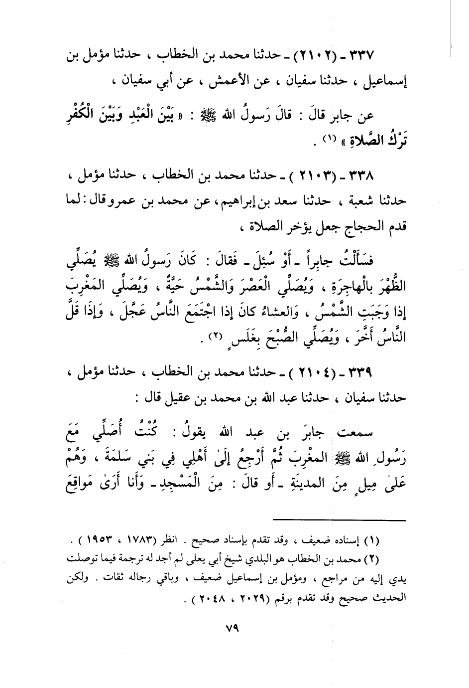 2103 - حَدَّثَنَا مُحَمَّدُ بْنُ الْخَطَّابِ، حَدَّثَنَا مُؤَمَّلُ، حَدَّثَنَا شُعْبَةُ، حَدَّثَنَا سَعْدُ بْنُ إِبْرَاهِيمَ، عَنْ مُحَمَّدِ بْنِ عَمْرٍو، قَالَ: لَمَّا قَدِمَ الْحَجَّاجُ جَعَلَ يُوَخِّرُ الصَّلَاةَ، فَسَأَلْتُ جَابِرًا، أَوْ سُئِلَ فَقَالَ: «كَانَ رَسُولُ اللَّهِ صَلَّى اللهُ عَلَيْهِ وَسَلَّمَ §يُصَلِّي الظُّهْرَ بِالْهَاجِرَةِ، وَيُصَلِّي الْعَصْرَ وَالشَّمْسُ حَيَّةٌ، وَيُصَلِّي الْمَغْرِبَ إِذَا وَجَبَتِ الشَّمْسُ، وَالْعِشَاءُ كَانَ إِذَا اجْتَمَعَ النَّاسُ عَجَّلَ، وَإِذَا قَلَّ النَّاسُ أَخَّرَ، وَيُصَلِّي الصُّبْحَ بِغَلَسٍ» Kالحديث صحيح
