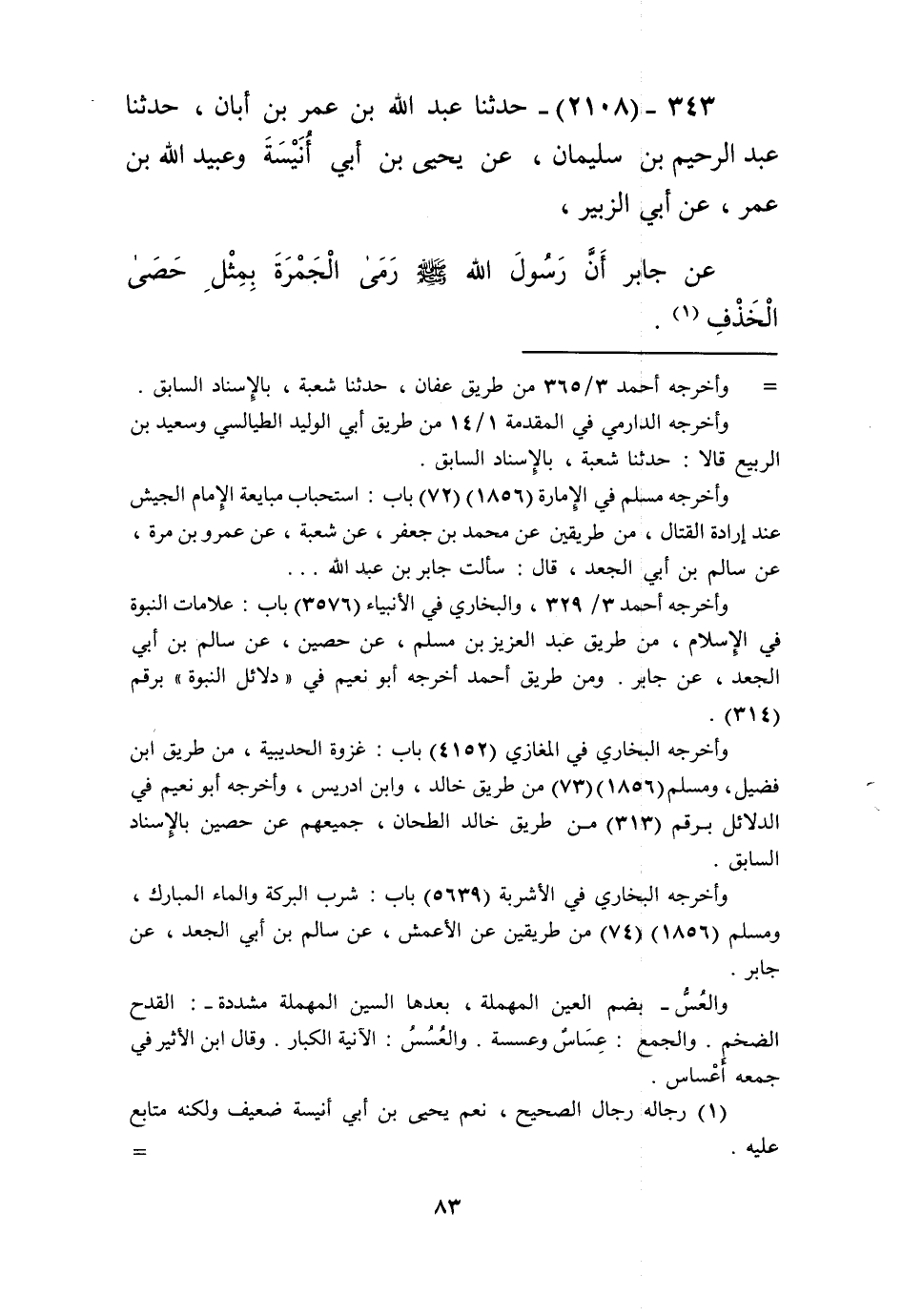 2108 - حَدَّثَنَا عَبْدُ اللَّهِ بْنُ عُمَرَ بْنِ أَبَانَ، حَدَّثَنَا عَبْدُ الرَّحِيمِ بْنُ سُلَيْمَانَ، عَنْ يَحْيَى بْنِ أَبِي أُنَيْسَةَ، وَعُبَيْدِ اللَّهِ بْنِ عُمَرَ، عَنْ أَبِي الزُّبَيْرِ، عَنْ جَابِرٍ، «أَنَّ رَسُولَ اللَّهِ صَلَّى اللهُ عَلَيْهِ وَسَلَّمَ §رَمَى الْجَمْرَةَ بِمِثْلِ حَصَى الْخَذْفِ» Kرجاله رجال الصحيح