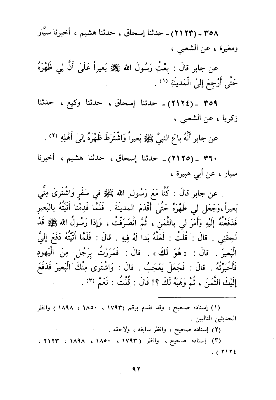 2123 - حَدَّثَنَا إِسْحَاقُ، حَدَّثَنَا هُشَيْمٌ، أَخْبَرَنَا سَيَّارٌ، وَمُغِيرَةُ، عَنِ الشَّعْبِيِّ، عَنْ جَابِرٍ، قَالَ: «§بِعْتُ رَسُولَ اللَّهِ صَلَّى اللهُ عَلَيْهِ وَسَلَّمَ بَعِيرًا عَلَى أَنَّ لِي ظَهْرَهُ حَتَّى أَرْجِعَ إِلَى الْمَدِينَةِ» Kإسناده صحيح