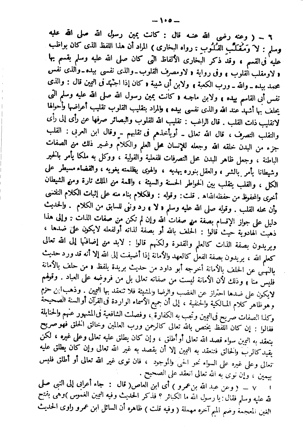 6- وعنه رضي الله عنه قال كانت يمين رسول الله صلى الله عليه وسلم "لا ومقلب القلوب" رواه البخاري المراد أن هذا اللفظ الذي كان يواظب عليه في القسم وقد ذكر البخاري الألفاظ التي كان صلى الله عليه وسلم يقسم بها "لا ومقلب القلوب" وفي رواية "لا ومصرف القلوب" "والذي نفسي بيده والذي نفس محمد بيده" "والله" "ورب الكعبة" ولابن أبي شيبة كان إذا اجتهد اليمين قال: "والذي نفس أبي القاسم بيده" ولابن ماجه كانت يمين رسول الله صلى الله عليه سلم التي يحلف بها أشهد عند الله والذي نفسي بيده والمراد بتقليب القلوب تقليب أعراضها وأحوالها لا تقليب ذات القلب قال الراغب تقليب الله القلوب والبصائر صرفها عن رأي إلى رأي والتقلب التصرف قال الله تعالى: {أَوْ يَأْخُذَهُمْ فِي تَقَلُّبِهِمْ} وقال ابن العربي: القلب جزء من البدن خلقه الله وجعله للإنسان محل العلم والكلام وغير ذلك من الصفات الباطنة وجعل ظاهر البدن محل التصرفات الفعلية والقولية ووكل به ملكا يأمر بالخير وشيطانا يأمر بالشر والعقل بنوره يهديه والهوى بظلمته يغويه والقضاء مسيطر على الكل والقلب يتقلب بين الخواطر الحسنة والسيئة واللمة من الملك تارة ومن الشيطان أخرى والمحفوظ من حفظه الله ا ه قلت وقوله والكلام بناء منه على إثبات الكلام النفسي وأن محله القلب وقوله صلى الله عليه وسلم لا رد ونفي للسابق من الكلام والحديث دليل على جواز الإقسام بصفة من صفات الله وإن لم تكن من صفات الذات وإلى هذا ذهبت الهادوية حيث قالوا الحلف بالله أو بصفة لذاته أو لفعله لا يكون على ضدها ويريدون بصفة الذات كالعلم والقدرة ولكنهم قالوا لا بد من إضافتها إلى الله تعالى كعلم الله ويريدون بصفة الفعل كالعهد والأمانة إذا أضيفت إلى الله إلا أنه قد ورد حديث بالنهي عن الحلف بالأمانة أخرجه أبو داود من حيث بريدة بلفظ من حلف بالأمانة فليس منا وذلك لأن الأمانة ليست من صفاته تعالى بل من فروضه عل العباد وقولهم لا يكون على ضدها احتراز عن الغضب والرضا والمشيئة فلاتنعقد بها اليمين وذهب ابن حزم وهو ظاهر كلام المالكية والحنفية إلى أن جميع الأسماء الواردة في القرآن أو السنة الصحيحة وكذا الصفات صريح في اليمين وتجب به الكفارة وفصلت الشافعية في المشهور عنهم والحنابلة فقالوا إن كان اللفظ يختص بالله تعالى كالرحمن ورب العالمين وخالق الخلق فهو صريح ينعقد به اليمين سواء قصد الله تعالى أو أطلق وإن كان يطلق عليه تعالى وعلى غيره لكن يقيد كالرب والخالق فتنعقد به اليمين إلا أن يقصد به غير الله تعالى وإن كان يطلق عليه وعلى غيره على السواء نحو الحي والموجود فإن نوي غير الله تعالى أو أطلق فليس بيمين وإن نوى به الله تعالى انعقد على الصحيح