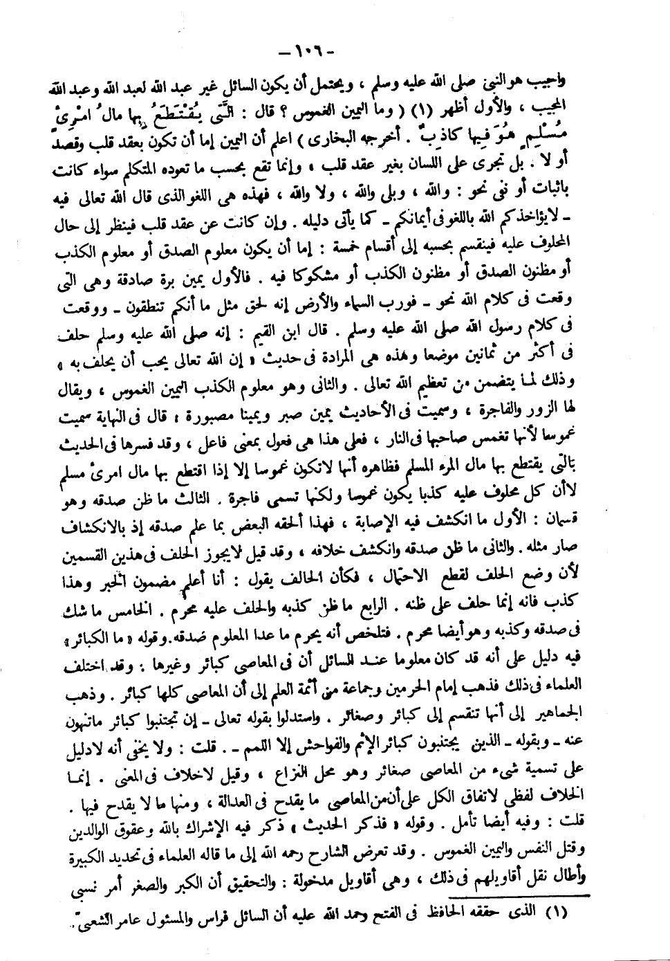 والمجيب هو النبي صلى الله عليه وسلم ويحتمل أن يكون السائل غير عبد الله لعبد الله وعبد الله المجيب والأول أظهر وما اليمين الغموس قال التي يقتطع بها مال امرىء مسلم هو فيها كاذب أخرجه البخاري اعلم أن اليمين إما أن تكون بعقد قلب وقصد أو لا بل تجري على اللسان بغير عقد قلب وإنما تقع بحسب ما تعوده المتكلم سواء كانت بإثبات أو نفي نحو والله وبلى والله ولا والله فهذه هي اللغو الذي قال الله تعالى فيه: {لَا يُؤَاخِذُكُمُ اللَّهُ بِاللَّغْوِ فِي أَيْمَانِكُمْ} كما يأتي دليله وإن كانت عن عقد قلب فينظر إلى حال المحلوف عليه فينقسم بحسبه إلى أقسام خمسة إما أن يكون معلوم الصدق أو معلوم الكذب أو مظنون الصدق أو مظنون الكذب أو مشكوكا فيه فالأول يمين برة صادقة وهي التي وقعت في كلام الله تعالى نحو {فَوَرَبِّ السَّمَاءِ وَالْأَرْضِ إِنَّهُ لَحَقٌّ مِثْلَ مَا أَنَّكُمْ تَنْطِقُونَ} ووقعت في كلام رسول الله صلى الله عليه وسلم قال ابن القيم: إنه صلى الله عليه وسلم حلف في أكثر من ثمانين موضعا وهذه هي المرادة في حديث إن الله تعالى يحب أن يحلف به وذلك لما يتضمن من تعظيم الله تعالى والثاني وهو معلوم الكذب اليمين الغموس ويقال لها الزور والفاجرة وسميت في الأحاديث يمين صبر ويمينا مصبورة قال في النهاية سميت غموسا لأنها تغمس صاحبها في النار فعلى هذا هي فعول بمعنى فاعل وقد فسرها في الحديث بالتي يقتطع بها مال المرء المسلم فظاهره أنها لا تكون غموسا إلا إذا اقتطع بها مال امريء مسلم لا أن كل محلوف كذبا يكون غموسا ولكنها تسمى فاجرة الثالث ما ظن صدقه وهو قسمان: الأول ما انكشف فيه الأصابة فهدا ألحقه البعض بما علم صدقه إذ بالانكشاف صار مثله والثاني ما ظن صدقه وانكشف خلافه وقد قيل لا يجوز الحلف في هذين القسمين لأن وضع الحلف لقطع الاحتمال فكأن الحالف يقول أنا أعلم مضمون الخبر وهذا كذب فإنه إنما حلف على ظنه الرابع ما ظن كذبه والحلف عليه محرم الخامس ما شك في صدقه وكذبه وهو أيضا محرم فتلخص أنه يحرم ما عدا المعلوم صدقه وقوله ما الكبائر فيه دليل على أنه قد كان معلوما عند السائل أن في المعاصي كبائر وغيرها وقد اختلف العلماء في ذلك فذهب إمام الحرمين وجماعة من أئمة العلم إلى أن المعاصي كلها كبائر وذهب الجماهير إلى أنها تنقسم إلى كبائر وصغائر واستدلوا بقوله تعالى: {إِنْ تَجْتَنِبُوا كَبَائِرَ مَا تُنْهَوْنَ عَنْهُ} وبقوله: {الَّذِينَ يَجْتَنِبُونَ كَبَائِرَ الْأِثْمِ وَالْفَوَاحِشَ إِلاَّ اللَّمَمَ} قلت ولا يخفى أنه لا دليل على تسمية شيء من المعاصي صغائر وهو محل النزاع وقيل لا خلاف في المعنى إنما الخلاف لفظي لاتفاق الكل على أن من المعاصي ما يقدح في العدالة ومنها ما لا يقدح فيها قلت وفيه أيضا تأمل وقوله فذكر الحديث ذكر فيه الإشراك بالله وعقوق الوالدين وقتل النفس واليمين الغموس وقد تعرض الشارح رحمه الله إلى ما قاله العلماء في تحديد الكبيرة وأطال نقل أقاويلهم في ذلك وهي أقاويل مدخولة والتحقيق أن الكبر والصغر أمر نسبي