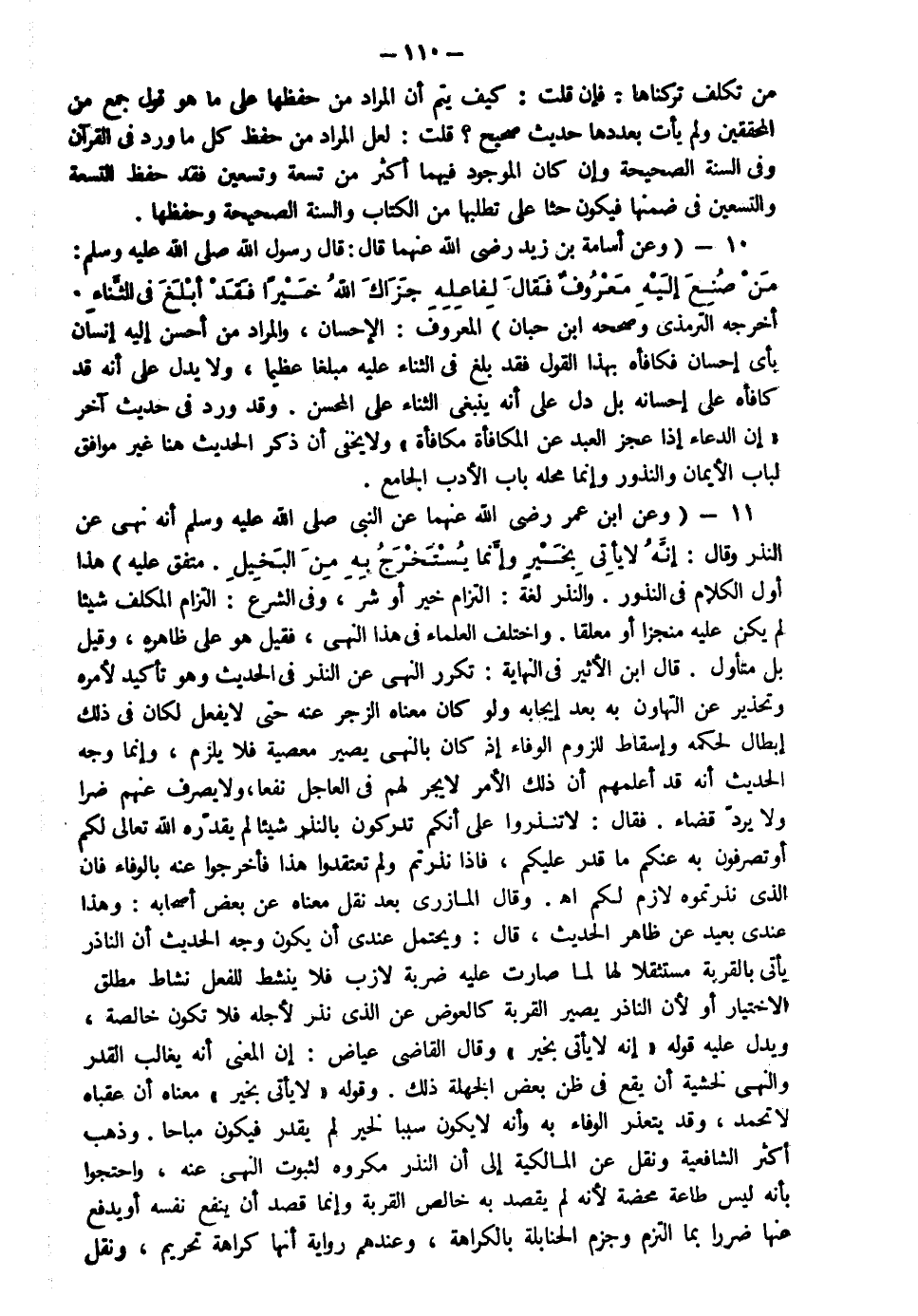 10- وعن أسامة بن زيد رضي الله عنهما قال قال رسول الله صلى الله عليه وسلم: "من صنع إليه معروف فقال لفاعله جزاك الله خيرا فقد أبلغ في الثناء" أخرجه الترمذي وصححه ابن حبان المعروف الإحسان والمراد من أحسن إليه إنسان بأي إحسان فكافأه بهذا القول فقد بلغ في الثناء عليه مبلغا عظيما ولا يدل على أنه قد كافأه على إحسانه بل دل على أنه ينبغي الثناء على المحسن وقد ورد في حديث آخر إن الدعاء إذا عجز العبد عن المكافأة مكافأة ولا يخفى أن ذكر الحديث هنا غير موافق لباب الأيمان والنذور وإنما محله باب الأدب الجامع