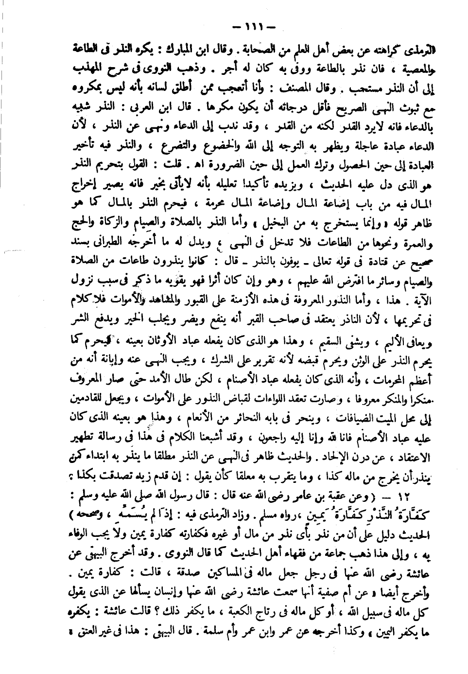 12- وعن عقبة بن عامر رضي الله عنه قال قال رسول الله صلى الله عليه وسلم: "كفارة النذر كفارة يمين" رواه مسلم وزاد الترمذي فيه إذا لم يسم وصححه الحديث دليل على أن من نذر بأي نذر من مال أو غيره فكفارته كفارة يمين ولا يجب الوفاء به وإلى هذا ذهب جماعة من فقهاء أهل الحديث كما قال النووي وقد أخرج البيهقي عن عائشة رضي الله عنها في رجل جعل ماله في المساكين صدقة قالت كفارة يمين وأخرج أيضا عن أم صفية أنها سمعت عائشة رضي الله عنها وإنسان يسألها عن الذي يقول كل ماله في سبيل الله أو كل ماله في رتاج الكعبة ما يكفر ذلك قالت عائشة يكفره ما يكفر اليمين وكذا أخرجه عن عمر وابن عمر وأم سلمة قال البيهقي هذا في غير العتق