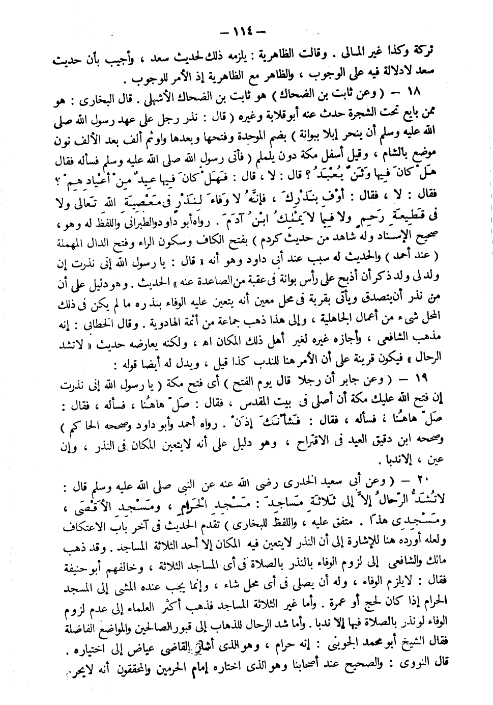 19- وعن جابر أن رجلا قال يوم الفتح أي فتح مكة يا رسول الله إني نذرت إن فتح الله عليك مكة أن أصلي في بيت المقدس فقال: "صل ها هنا" فسأله فقال: "صل ها هنا" فسأله فقال: "فشأنك إذن" رواه أحمد وأبو داود وصححه الحاكم وصححه ابن دقيق العيد في الاقتراح وهو دليل على أنه لا يتعين المكان في النذر وإن عين إلا ندبا