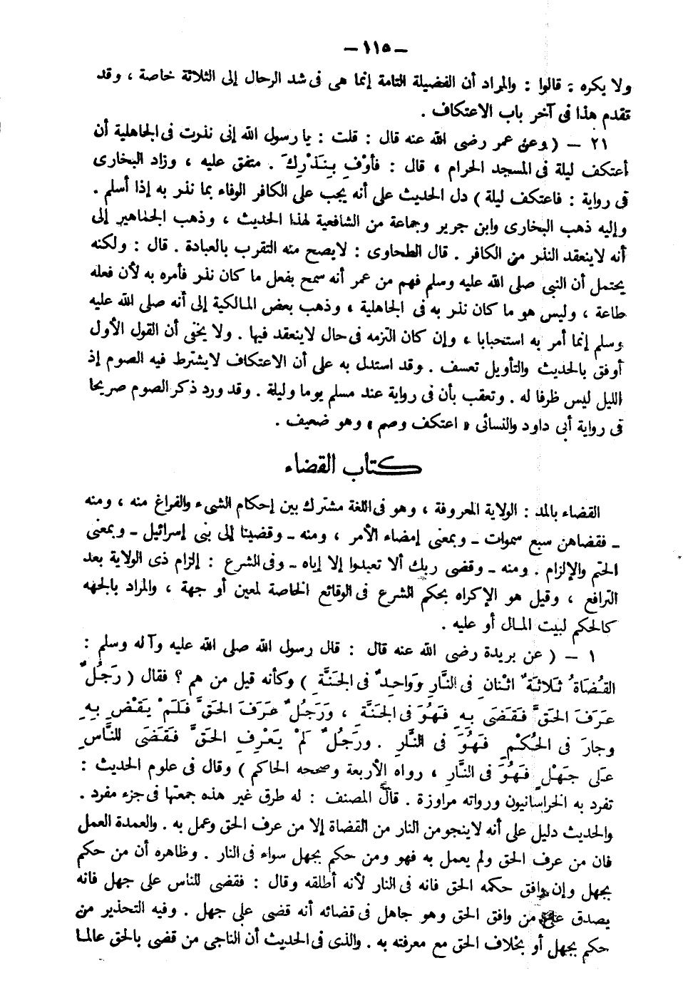 21- وعن عمر رضي الله عنه قال قلت: يا رسول الله إني نذرت في الجاهلية أن أعتكف ليلة في المسجد الحرام قال: "فأوف بنذرك" متفق عليه وزاد البخاري في رواية فاعتكف ليلة دل الحديث على أنه يجب على الكافر الوفاء بما نذر به إذا أسلم وإليه ذهب البخاري وابن جرير وجماعة من الشافعية لهذا الحديث وذهب الجماهير إلى أنه لا ينعقد النذر من الكافر قال الطحاوي لا يصح منه التقرب بالعبادة قال ولكنه يحتمل أن النبي صلى الله عليه سلم فهم من عمر أنه سمح بفعل ما كان نذر فأمره به لأن فعله طاعة وليس هو ما كان نذر به في الجاهلية وذهب بعض المالكية إلى أنه صلى الله عليه سلم إنما أمر به استحبابا وإن كان التزمه في حال لا ينعقد فيها ولا يخفى أن القول الأول أوفق بالحديث والتأويل تعسف وقد استدل به على أن الاعتكاف لا يشترط فيه الصوم إذ الليل ليس ظرفا له وتعقب بأن في رواية عند مسلم يوما وليلة وقد ورد ذكر الصوم صريحا في رواية أبي داود والنسائي اعتكف وصم وهو ضعيف