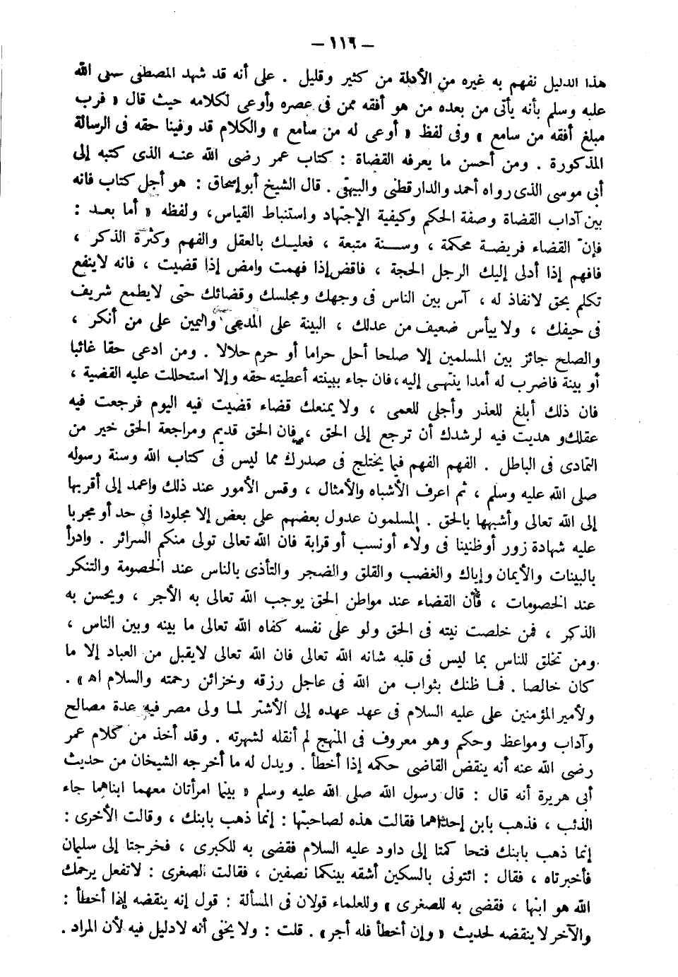هذا الدليل نفهم به غيره من الأدلة من كثير وقليل على أنه قد شهد المصطفى صلى الله عليه سلم بأنه يأتي من بعده من هو أفقه ممن في عصره وأوعى لكلامه حيث قال "فرب مبلغ أفقه من سامع" وفي لفظ "أوعى له من سامع" والكلام قد وفينا حقه في الرسالة المذكورة ومن أحسن من ما يغرفه القضاة كتاب عمر رضي الله عنه الذي كتبه إلى أبي موسى الذي رواه أحمد والدارقطني والبيهقي قال الشيخ أبو إسحاق هو أجل كتاب فإنه بين آداب القضاة وصفة الحكم وكيفية الاجتهاد واستنباط القياس ولفظه أما بعد فإن القضاء فريضة محكمة وسنة متبعة فعليك بالعقل والفهم وكثرة الذكر فافهم إذا أدلى إليك الرجل الحجة فاقض إذا فهمت وامض إذا قضيت فإنه لا ينفع تكلم بحق لا نفاذ له آس بين الناس في وجهك ومجلسك وقضائك حتى لا يطمع شريف في حيفك ولا ييأس ضعيف من عدلك البينة على المدعي واليمين على من أنكر والصلح جائز بين المسلمين إلا صلحا أحل حراما أو حرم حلالا ومن ادعى حقا غائبا أو بينة فاضرب له أمدا ينتهي إليه فإن جاء ببينة أعطيته حقه وإلا استحللت عليه القضية فإن ذلك أبلغ في العذر وأجلى للعمى ولا يمنعك قضاء قضيت فيه اليوم فراجعت فيه عقلك وهديت فيه لرشدك أن ترجع إلى الحق فإن الحق قديم ومراجعة الحق خير من التمادي في الباطل الفهم الفهم فيما يختلج في صدرك مما ليس في كتاب الله وسنة رسوله صلى الله عليه سلم ثم اعرف الأشباه والأمثال وقس الأمور عند ذلك واعمد إلى أقربها إلى الله تعالى وأشببها بالحق المسلمون عدول بعضهم على بعض إلا مجلودا في حد أو مجربا عليه شهادة زور أو ظنينا في ولاء أو نسب أو قرابة فإن الله تعالى تولى منكم السرائر وادرأ بالبينات والأيمان وإياك والغضب والقلق والضجر والتأذي بالناس عند الخصومة والتنكر عند الخصومات فإن القضاء عند مواطن الحق يوجب الله تعالى به الأجر ويحسن به الذكر فمن خلصت نيته في الحق ولو على نفسه كفاه الله تعالى ما بينه وبين الناس ومن تخلق للناس بما ليس في قلبه شانه الله تعالى فإن الله تعالى لا يقبل من العباد إلا ما كان خالصا فما ظنك بثواب من الله في عاجل رزقه وخزائن رحمته والسلام ا ه ولأمير المؤمنين علي عليه السلام في عهد عهده إلى الأشتر لما ولي مصر فيه عدة مصالح وآداب ومواعظ وحكم وهو معروف في النهج لم أنقله لشهرته وقد أخذ من كلام عمر رضي الله عنه أنه ينقض القاضي حكمه إذا أخطأ ويدل له ما أخرجه الشيخان من حديث أبي هريرة أنه قال قال رسول الله صلى الله عليه وسلم: "بينما امرأتان معهما ابناهما جاء الذئب فذهب بابن إحداهما فقالت هذه لصاحبتها إنما ذهب بابنك وقالت الأخرى إنما ذهب بابنك فتحاكمتا إلى داود عليه السلام فقضى به للكبرى فخرجتا إلى سليمان فأخبرتاه فقال ائتوني بالسكين أشقه بينكما نصفين فقالت الصغرى لا تفعل يرحمك الله هو ابنها فقضى به للصغرى" وللعلماء قولان في المسألة: قول إنه ينقضه إذا أخطأ والآخر لا ينقضه لحديث "وإن أخطأ فله أجر"