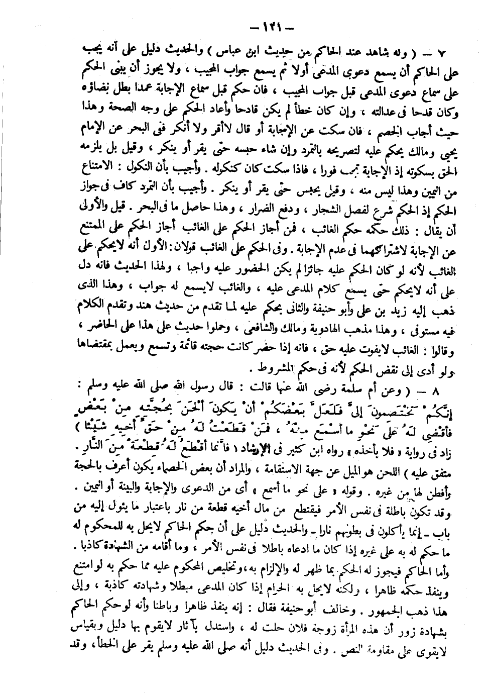 7- وله شاهد عند الحاكم من حديث ابن عباس رضي الله عنهما والحديث دليل على أنه يجب على الحاكم أن يسمع دعوى المدعي أولا ثم يسمع جواب المجيب ولا يجوز له أن يبني الحكم على سماع دعوى المدعي قبل جواب المجيب فإن حكم قبل سماع الإجابة عمدا بطل قضاؤه وكان قدحا في عدالته وإن كان خطأ لم يكن قادحا وأعاد الحكم على وجه الصحة وهذا حيث أجاب الخصم فإن سكت عن الإجابة أو قال لا أقر ولا أنكر ففي البحر عن الإمام يحيى ومالك يحكم عليه لتصريحه بالتمرد وإن شاء حبسه حتى يقر أو ينكر وقيل بل يلزمه الحق بسكوته إذ الإجابة تجب فورا فإذا سكت كان كنكوله وأجيب بأن النكول الامتناع من اليمين وهذا ليس منه وقيل يحبس حتى يقر أو ينكر وأجيب بأن التمرد كاف في جواز الحكم إذ الحكم شرع لفصل الشجار ودفع الضرار وهذا حاصل ما في البحر قيل والأولى أن يقال ذلك حكمه حكم الغائب فمن أجاز الحكم على الغائب أجاز الحكم على الممتنع عن الإجابة باشتراكهما في عدم الإجابة وفي الحكم على الغائب قولان الأول أنه لا يحكم على الغائب لأنه لو كان الحكم عليه جائزا لم يكن الحضور عليه واجبا ولهذا الحديث فإنه دل على أنه لا يحكم حتى يسمع كلام المدعى عليه والغائب لا يسمع له جواب وهذا الذي ذهب إليه زيد بن علي وأبو حنيفة والثاني يحكم عليه لما تقدم من حديث هند وتقدم الكلام فيه مستوفى وهذا مذهب الهادوية ومالك والشافعي وحملوا حديث علي هذا على الحاضر وقالوا الغائب لا يفوت عليه حق فإنه إذا حضر كانت حجته قائمة وتسمع ويعمل بمقتضاها ولو أدى إلى نقض الحكم لأنه في حكم المشروط