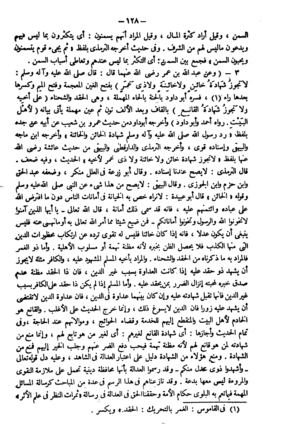 3- وعن عبد الله بن عمرو رضي الله عنهما قال قال رسول الله صلى الله عليه وآله وسلم: "لا تجوز شهادة خائن ولا خائنة ولا ذي غمر" بفتح الغين المعجمة وفتح الميم وكسرها بعدها راء فسره أبو داود بالحنة بالحاء المهملة وهي الحقد والشحناء على أخيه ولا تجوز شهادة القانع بالقاف وبعد الألف نون ثم عين مهملة يأتي بيانه لأهل البيت رواه أحمد وأبو داود وأخرجه أبو داود من حديث عمرو بن شعيب عن أبيه عن جده بلفظ "رد رسول الله صلى الله عليه وآله وسلم شهادة الخائن والخائنة" وأخرجه ابن ماجه والبيهقي وإسناده قوي وأخرجه الترمذي والدارقطني والبيهقي من حديث عائشة رضي الله عنها بلفظ لا تجوز شهادة خائن ولا خائنة وذي غمر لأخيه الحديث وفيه ضعف قال الترمذي لا يصح عندنا إسناده وقال أبو زرعة في العلل منكر وضعفه عبد الحق وابن حزم وابن الجوزي وقال البيهقي لا يصح من هذا شيء عن النبي صلى الله عليه وسلم وقوله الخائن قال أبو عبيدة لا نراه خص به الخيانة في أمانات الناس دون ما افترض الله على عباده وأتمنهم عليه فإنه قد سمى ذلك أمانة قال الله تعالى: {يَا أَيُّهَا الَّذِينَ آمَنُوا لا تَخُونُوا اللَّهَ وَالرَّسُولَ وَتَخُونُوا أَمَانَاتِكُمْ} فمن ضيع شيئا مما أمر الله تعالى به أو نهى عنه فليس ينبغي أن يكون عدلا فإنه إذا كان خائنا فليس له تقوى ترده عن ارتكاب محظورات الدين التى منها الكذب فلا يحصل الظن بخبره لأنه مظنه تهمة أو مسلوب الأهلية.وأما ذو الغمر فلمراد به ما ذكرناه من الحقد والشحناء.والمراد بأخية المسلم المشهود عليه،والكافر مثله لا يجوز أن يشهد ذو حقد عليه إذا كانت العدواة بسبب غير الدين،فإن ذا الحقد مظنة عدم صدق خبره لمحبته إنزال الضرر بمن يحقد عليه. وأما المسلم إذا لم يكن ذا حقد على الكافر بسبب غير الدين فإنها تقبل شهادته عليه وإن كان بينهما عداوة في الدين، فإن عداوة الدين لا تقتضي أن يشهد عليه زورا فإن الدين لا يسوغ ذلك، وإنما خرج الحديث على الأغلب والقانع هو الخادم لأهل البيت والمنقطع إليهم للخدمة وقضاء الحوائج، وموالاتهم عند الحاجة وفي تمام الحديث وأجازها:أي شهادة القانع لغيرهم: أي لغير من هو تابع لهم، وإنما منع من شهادته لمن هو قانع لهم لأنه مظنة تهمة فيحب دفع الضر عنهم وجلب الخير إليهم فمنع من الشهادة. ومنع هؤلاء من الشهادة دليل على اعتبار العدالة في الشاهد، وعليه دل قوله تعالى: {وَأَشْهِدُوا ذَوَيْ عَدْلٍ مِنْكُمْ} وقد رسموا العدالة بأنها محافظة دينية تحمل على ملازمة التقوى والمروءة ليس معها بدعة وقد نازعناهم في هذا الرسم في عدة من المباحث كرسالة المسائل المهمة فيما تعم به البلوى حكام الأمة وحققنا الحق في العدالة في رسالة ثمرات النظر في علم الأثر