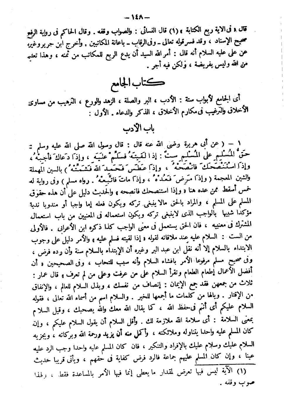 1- عن أبي هرير رضي الله عنه قال قال رسول الله صلى الله عليه وسلم: "حق المسلم على المسلم ست إذا لقيته فسلم عليه وإذا دعاك فأجبه وإذا استنصحك فانصحه وإذا عطس فحمد الله فشمته" بالسين المهملة والشين "وإذا مرض فعده وإذا مات فاتبعه" رواه مسلم وفي رواية له خمس أسقط مما عده هنا "وإذا استنصحك فانصحه" والحديث دليل على أن هذه حقوق المسلم على المسلم والمراد بالحق ما لا ينبغي تركه ويكون فعله إما واجبا أو مندوبا ندبا مؤكدا شبيها بالواجب الذي لا ينبغي تركه ويكون استعماله في المعنيين من باب استعمال المشترك في معنييه فإن الحق يستعمل في معنى الواجب كذا ذكره ابن الأعرابي فالأولى من الست السلام عليه عند ملاقاته لقوله "إذا لقيته فسلم عليه" والأمر دليل على وجوب الابتداء بالسلام إلا أنه نقل ابن عبد البر وغيره أن الابتداء بالسلام سنة وأن رده فرض وفي صحيح مسلم مرفوعا الأمر بإفشاء السلام وأنه سبب للتحاب وفي الصحيحين "إن أفضل الأعمال إطعام الطعام وتقرأ السلام على من عرفت وعلى من لم تعرف" قال عمار: ثلاث من جمعهن فقد جمع الإيمان إنصاف من نفسك وبذل السلام للعالم والإنفاق من الاقتار ويا لها من كلمات ما أجمعها للخير والسلام اسم من أسماء الله تعالى فقوله السلام عليكم أي أنتم في حفظ الله كما يقال الله معك والله يصحبك وقيل السلام بمعنى السلامة أي سلامة الله ملازمة لك وأقل السلام أن يقول السلام عليكم وإن كان المسلم عليه واحدا يتناوله وملائكته وأكمل منه أن يزيد ورحمة الله وبركاته ويجزيه السلام عليك وسلام عليك بالإفراد والتنكير فإن كان المسلم عليه واحدا وجب الرد عليه عينا وإن كان المسلم عليهم جماعة فالرد فرض كفاية في حقهم ويأتي قريبا حديث