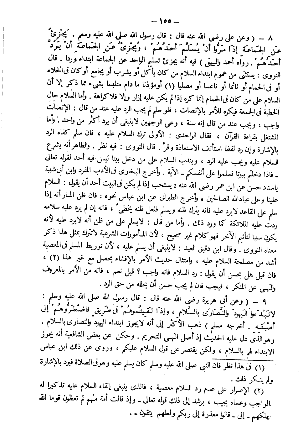 8- وعن علي رضي الله عنه قال قال رسول الله صلى الله عليه وسلم: " يجزىء عن الجماعة إذا مروا أن يسلم أحدهم ويجزىء عن الجماعة أن يرد أحدهم" رواه أحمد والبيهقي فيه يجزىء تسليم الواحد عن الجماعة ابتداء وردا قال النووي يستثنى من عموم ابتداء السلام من كان يأكل أو يشرب أو يجامع أو كان في الخلاء أو في الحمام أو نائما أو ناعسا أو مصليا أو مؤذنا ما دام متلبسا بشيء مما ذكر إلا أن السلام على من كان في الحمام إنما كره إذا لم يكن عليه إزار وإلا فلا كراهة وأما السلام حال الخطبة في الجمعة فيكره للأمر بالإنصات فلو سلم لم يجب الرد عليه عند من قال الإنصات واجب ويجب عند من قال إنه سنة وعلى الوجهين لا ينبغي أن يرد أكثر من واحد وأما المشتغل بقراءة القرآن فقال الواحدي الأولى ترك السلام عليه فإن سلم كفاه الرد بالإشارة وإن رد لفظا استأنف الاستعاذة وقرأ قال النووي وفيه نظر والظاهر أنه يشرع السلام عليه ويجب عليه الرد ويندب السلام على من دخل بيتا ليس فيه أحد لقوله تعالى: {إِذَا دَخَلْتُمْ بُيُوتاً فَسَلِّمُوا عَلَى أَنْفُسِكُمْ} الآية وأخرج البخاري في الأدب المفرد وابن أبي شيبة بإسناد حسن عن ابن عمر رضي الله عنه يستحب إذا لم يكن في البيت أحد أن يقول السلام علينا وعلى عباد الله الصالحين وأخرج الطبراني عن ابن عباس نحوه فإن ظن ظن المار الإشارة أنه سلم على القاعد لا يرد عليه فإنه يترك ظنه ويسلم فلعل ظنه يخطىء فإنه إن لم يرد عليه سلامه ردت عليه الملائكة كما ورد ذلك وأما من قال لا يسلم على من ظن أنه لا يرد عليه لأنه يكون سببا لتأثيم الآخر فهو كلام غير صحيح لأن المأمورات الشرعية لا تترك بمثل هذا ذكر معناه النووي وقال ابن دقيق العيد لا ينبغي أن يسلم عليه لأن توريط المسلم في المعصية أشد من مصلحة السلام عليه وامتثال حديث الأمر بالإفشاء يحصل مع غير هذا فإن قيل هل يحسن أن يقول رد السلام فإنه واجب قيل نعم فإنه من الأمر بالمعروف والنهي عن المنكر فيجب فإن لم يجب حسن أن يحلله من حق الرد