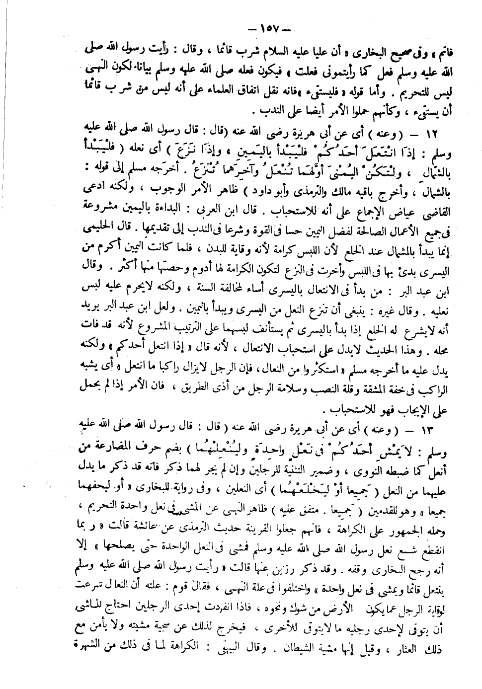 12- وعنه أي عن أبي هريرة رضي الله عنه قال قال رسول الله صلى الله عليه وسلم: "إذا انتعل أحدكم فليبدأ باليمين وإذا نزع أي نعله فليبدأ بالشمال ولتكن اليمنى أولهما تنعل وآخرهما تنزع " أخرجه مسلم إلى قوله بالشمال وأخرج باقيه مالك والترمذي وأبو داود ظاهر الأمر الوجوب ولكنه ادعى القاضي عياض الإجماع على أنه للاستحباب قال ابن العربي البداءة باليمين مشروعة في جميع الأعمال الصالحة لفضل اليمين حسا في القوة وشرعا في الندب إلى تقديمها قال الحليمي إنما يبدأ بالشمال عند الخلع لأن اللبس كرامة لأنه وقاية للبدن فلما كانت اليمين أكرم من اليسرى بدأ بها في اللبس وأخرت في النزع لتكون الكرام لها أدوم وحصتها منها أكثر وقال ابن عبد البر من بدأ في الانتعال باليسرى أساء لمخالفة السنة ولكن لا يحرم عليه لبس نعليه وقال غيره ينبغي أن تنزع النعل من اليسرى ويبدأ باليمين ولعل ابن عبد البر يريد أنه لا يشرع له الخلع إذا بدأ باليسرى ثم يستأنف لبسهما على الترتيب المشروع لأنه قد فات محله وهذا الحديث لا يدل على استحباب الانتعال لأنه قال إذا انتعل أحدكم ولكنه يدل عليه ما أخرجه مسلم استكثروا من النعال فإن الرجل لا يزال راكبا ما انتعل أي يشبه الراكب في خفة المشقة وقلة النصب وسلامة الرجل من أذى الطريق فإن الأمر إذا لم يحمل على الإيجاب فهو للاستحباب وعنه رضي الله عنه قال قال رسول الله صلى الله عليه وسلم لا يمش أحدكم في نعل واحدة ولينعلهما جميعا أو ليخلعهما جميعا متفق عليه