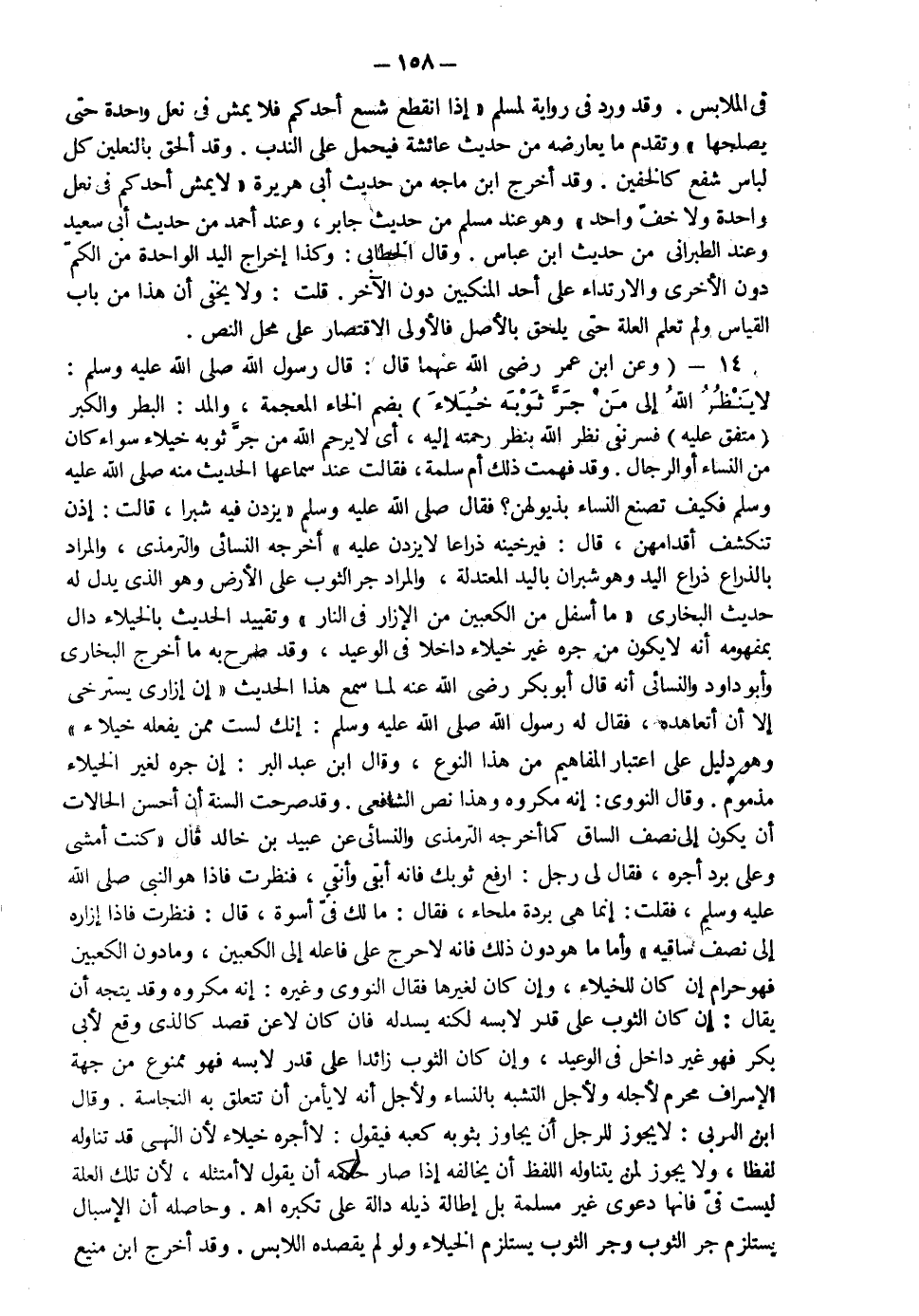 14- وعن ابن عمر رضي الله عنهما قال قال رسول الله صلى الله عليه وسلم: "لا ينظر الله إلى من جر ثوبه خيلاء" بضم الخاء المعجمة والمد البطر والكبر (متفق عليه) فسر نفي نظر الله بنظر رحمته إليه أي لا يرحم الله من جر ثوبه خيلاء سواء كان من النساء أو الرجال وقد فهمت ذلك أم سلمة فقالت عند سماعها الحديث منه صلى الله عليه وسلم فكيف تصنع النساء بذيولهن فقال صلى الله عليه وسلم: "يزدن فيه شبرا" قالت إذا تنكشف أقدامهن قال : "فيرخينه ذراعا لا يزدن عليه" أخرجه النسائي والترمذي والمراد بالذراع ذراع اليد وهو شبران باليد المعتدلة والمراد جر الثوب على الأرض وهو الذي يدل له حديث البخاري ما أسفل من الكعبين من الإزار في النار وتقييد الحديث بالخيلاء دال بمفهومه أنه لا يكون من جره غير خيلاء داخلا في الوعيد وقد صرح به ما أخرج البخاري وأبو داود والنسائي أنه قال أبو بكر رضي الله عنه لما سمع هذا الحديث إن إزاري يسترخي إلا أن أتعاهده فقال له صلى الله عليه وسلم إنك لست ممن يفعله خيلاء وهو دليل على اعتبار المفاهيم من هذا النوع وقال ابن عبد البر إن جره لغير الخيلاء مذموم وقال النووي إنه مكروه وهذا نص الشافعي وقد صرحت السنة أن أحسن الحالات أن يكون إلى نصف الساق كما أخرجه الترمذي والنسائي عن عبيد بن خالد قال كنت أمشي وعلي برد أجره فقال لي رجل ارفع ثوبك فإنه أبقى وأنقى فنظرت فإذا هو النبي صلى الله عليه وسلم فقلت إنما هي بردة ملحاء فقال مالك في أسوة قال فنظرت فإذا إزاره إلى نصف ساقيه وأما ما هو دون ذلك فإنه لا حرج على فاعله إلى الكعبين وما دون الكعبين فهو حرام إن كان للخيلاء وإن كان لغيرها فقال النووي وغيره إنه مكروه وقد يتجه أن يقال إن كان الثوب على قدر لابسه لكنه يسدله فإن كان لا عن قصد كالذي وقع لأبي بكر فهو غير داخل في الوعيد وإن كان الثوب زائدا على قدر لابسه فهو ممنوع من جهة الإسراف محرم لأجله ولأجل التشبه بالنساء ولأجل أنه لا يأمن أن تتعلق به النجاسة وقال ابن العربي لا يجوز للرجل أن يجاوز بثوبه كعبه فيقول لا أجره خيلاء لأن النهي قد تناوله لفظا ولا يجوز لمن يتناوله اللفظ أن يخالفه إذ صار حكمه أن يقول لا أمتثله لأن تلك العلة ليست في فإنها دعوى غير مسلمة بل إطالة ذيله دالة على تكبره ا ه وحاصله أن الإسبال يستلزم جر الثوب وجر الثوب يستلزم الخيلاء ولو لم يقصده اللابس وقد أخرج ابن منيع