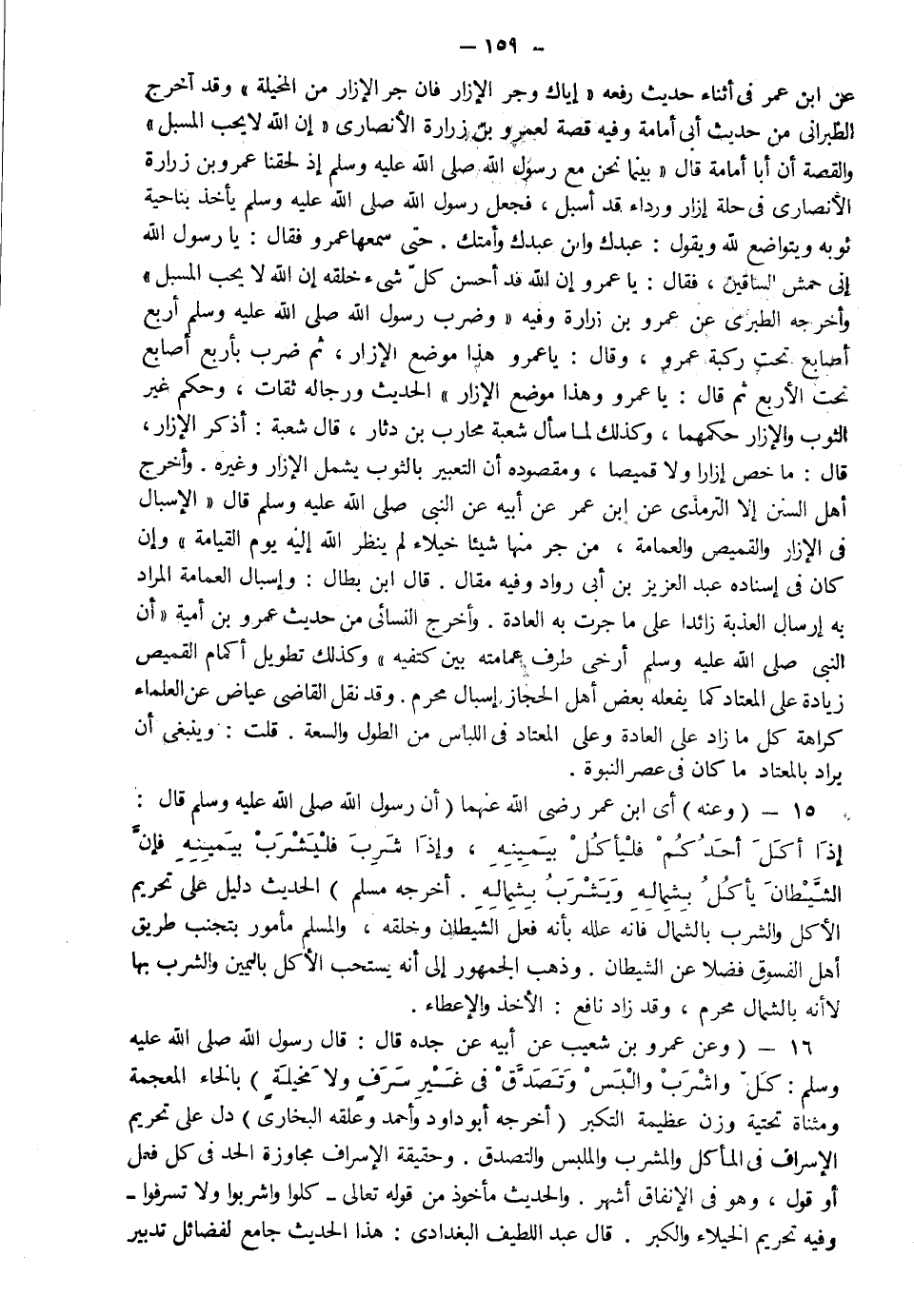 16- وعن عمرو بن شعيب عن أبيه عن جده رضي الله عنهم قال قال رسول الله صلى الله عليه وسلم: "كل واشرب والبس وتصدق في غير سرف ولا مخيلة" بالخاء المعجمة ومثناة تحتية وزن عظيمة التكبر أخرجه أبو داود وأحمد وعلقه البخاري دل على تحريم الإسراف في المأكل والمشرب والملبس والتصدق وحقيقة الإسراف مجاوزة الحد في كل فعل أو قول وهو في الإنفاق أشهر والحديث مأخوذ من قوله تعالى: {وَكُلُوا وَاشْرَبُوا وَلا تُسْرِفُوا} وفيه تحريم الخيلاء والكبر قال عبد اللطيف البغدادي هذا الحديث جامع لفضائل تدبير