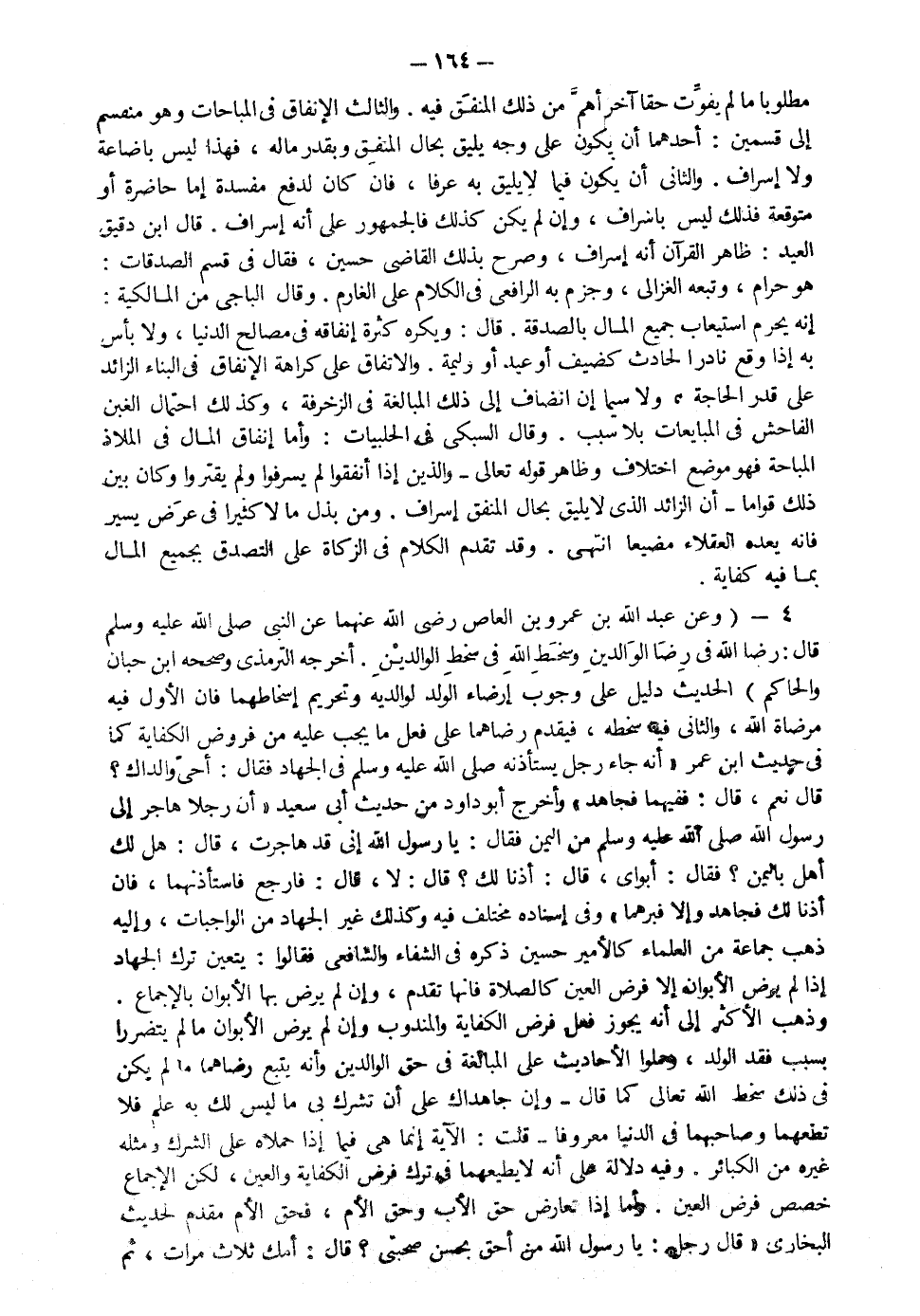 4- وعن عبد الله بن عمرو بن العاص رضي الله عنهما عن النبي صلى الله عليه وسلم قال: "رضا الله في رضا الوالدين وسخط الله في سخط الوالدين" أخرجه الترمذي وصححه ابن حبان والحاكم الحديث دليل على وجوب إرضاء الوالد لوالديه وتحريم إسخاطهما فإن الأول فيه مرضاة الله والثاني فيه سخطه فيقدم رضاهما على فعل ما يجب عليه من فروض الكافية كما في حديث ابن عمر أنه جاء رجل يستأذنه صلى الله عليه وسلم في الجهاد فقال: "أحي والداك؟" قال نعم قال: "ففيهما فجاهد" وأخرج أبو داود من حديث أبي سعيد أن رجلا هاجر إلى رسول الله صلى الله عليه وسلم من اليمن فقال يا رسول الله إني قد هاجرت قال "هل لك أهل باليمن" فقال أبواي قال "أذنا لك" قال لا قال " فارجع فاستأذنهما فإن أذنا لك فجاهد وإلا فبرهما" وفي إسناده مختلف فيه وكذلك غير الجهاد من الواجبات وإليه ذهب جماعة من العلماء كالأمير حسين ذكره في الشفاء والشافعي فقالوا يتعين ترك الجهاد إذا لم يرض الأبوان إلا فرض العين كالصلاة فإنها تقدم وإن لمن يرض بها الأبوان بالإجماع وذهب الأكثر لى أنه يجوز فعل فرض الكفاية والمندوب وإن لم يرض الأبوان ما لم يتضرر بسبب فقد الولد وحملوا الأحاديث على المبالغة في حق الوالدين وأنه يتبع رضاهما ما لم يكن في ذلك سخط الله كما قال تعالى: {وَإِنْ جَاهَدَاكَ عَلَى أَنْ تُشْرِكَ بِي مَا لَيْسَ لَكَ بِهِ عِلْمٌ فَلا تُطِعْهُمَا وَصَاحِبْهُمَا فِي الدُّنْيَا مَعْرُوفاً} قلت الآية إنما هي فيما إذا حملاه على الشرك ومثله غيره من الكبائر وفيه دلالة على أنه لا يطيعهما في ترك فرض الكفاية والعين لكن الإجماع خصص فرض العين وأما إذا تعارض حق الأب وحق الأم فحق الأم مقدم لحديث البخاري قال رجل يا رسول الله من أحق بحسن صحبتي؟ قال: "أمك" ثلاث مرات ثم