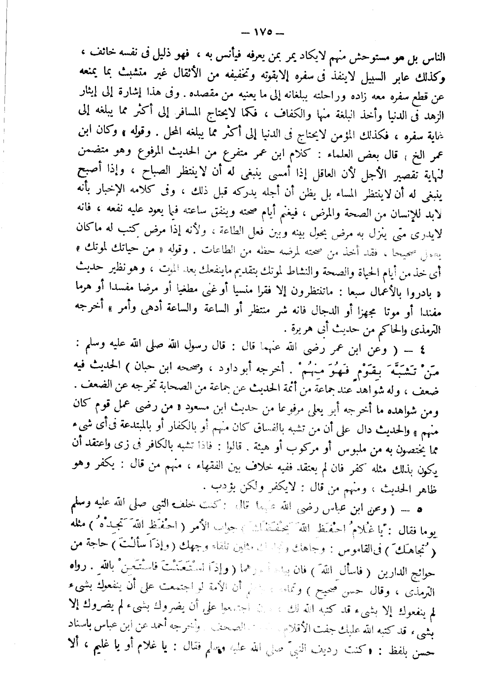 4- وعن ابن عمر رضي الله عنهما قال قال رسول الله صلى الله عليه وسلم: " من تشبه بقوم فهو منهم" أخرجه أبو داود وصححه ابن حبان الحديث فيه ضعيف وله شواهد عند جماعة من أئمة الحديث عن جماعة من الصحابة تخرجه عن الضعف ومن شواهده ما أخرجه أبو يعلي مرفوعا من حديث ابن مسعود "من رضي عمل قوم كان منهم" والحديث دال على أن من تشبه بالفساق كان منهم أو بالكفار أو المبتدعة في أي شيء مما يختصون به من ملبوس أو مركوب أو هيئة قالوا فإذا تشبه بالكفار في زي واعتقد أن يكون بذلك مثله كفر فإن لم يعتقد ففيه خلاف بين الفقهاء منهم من قال يكفر وهو ظاهر الحديث ومنهم من قال لا يكفر ولكن يؤدب