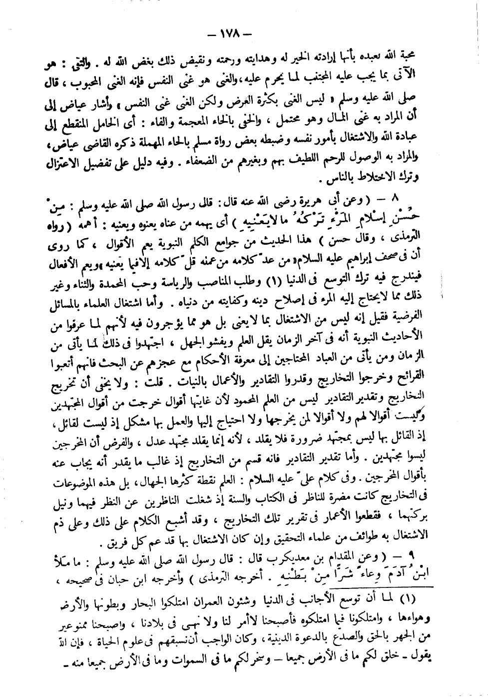 هذا الحديث من جوامع الكلم النبوية يعم الأقوال كما روي أن في صحف إبراهيم عليه السلام من عد كلامه من عمله قل كلامه إلا فيما يعنيه ويعم الأفعال فيندرج فيه ترك التوسع في الدنيا وطلب المناصب والرياسة وحب المحمدة والثناء وغير ذلك ما لا يحتاج إليه المرء في إصلاح دينه وكفايته من دنياه وأما اشتغال العلماء بالمسائل الفرضية فقيل إنه ليس من الاشتغال بما لا يعني بل هو مما يؤجرون فيه لأنهم لما عرفوا من الأحاديث النبوية أنه في آخر الزمان يقل العلم ويفشو الجهل اجتهدوا في ذلك لما يأتي من الزمان ومن يأتي من العباد المحتاجين إلى معرفة الأحكام مع عجزهم عن البحث فإنهم أتعبوا القرائح وخرجوا التخاريج وقدروا التقادير والأعمال بالنيات قلت ولا يخفى أن تخريج التخاريج وتقدير التقادير ليس من العلم المحمود لأن غايتها أقوال خرجت من أقوال المجتهدين وليست أقوالا لهم ولا أقوالا لمن يخرجها ولا احتياج إليها والعمل بها مشكل إذ ليست لقائل إذ القائل بها ليس بمجتهد ضرورة فلا يقلد لأنه إنما يقلد مجتهد عدل والفرض أن المخرجين ليسوا مجتهدين وأما تقدير التقادير فإنه قسم من التخاريج إذ غالب ما يقدر أنه يجاب عنه بأقوال المخرجين وفي كلام علي عليه السلام العلم نقطة كثرها الجهال بل هذه الموضوعات في التخاريج كانت مضرة للناظر في الكتاب والسنة إذ شغلت الناظرين عن النظر فيهما ونيل بركتهما فقطعوا الأعمار في تقرير تلك التخاريج وقد أشبع الكلام على ذلك وعلى ذم الاشتغال به طوائف من علماء التحقيق وإن كان الاشتغال بها قد عم كل فريق