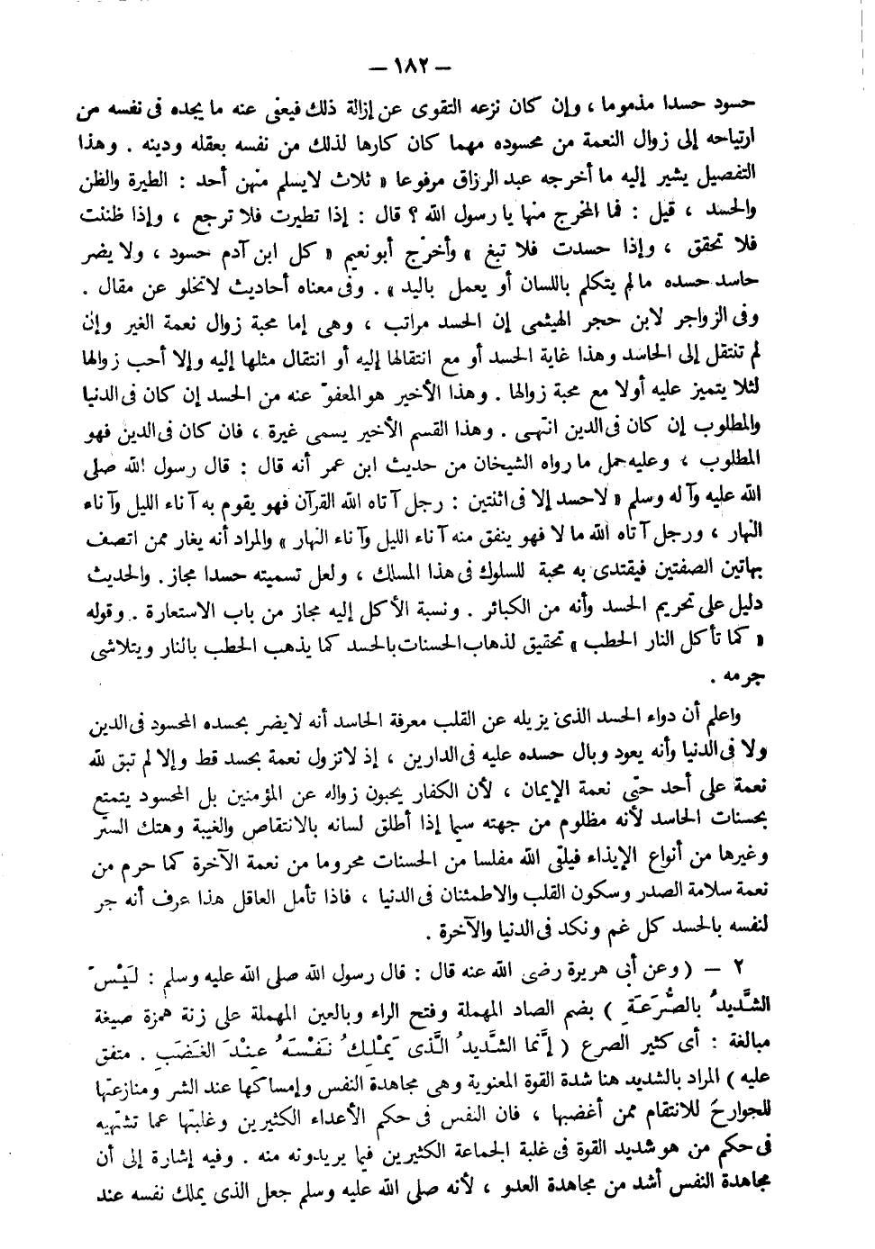 2- وعن أبي هريرة رضي الله عنه قال قال رسول الله صلى الله عليه وسلم: "ليس الشديد بالصرعة" بضم الصاد المهملة وفتح الراء وبالعين المهملة على زنة همزة صيغة مبالغة أي كثير الصرع "إنما الشديد الذي يملك نفسه عند الغضب" متفق عليه المراد بالشديد هنا شد القوة المعنوية وهي مجاهدة النفس وإمساكها عند الشر ومنازعتها للجوارح للانتقام ممن أغضبها فإن النفس في حكم الأعداء الكثيرين وغلبتها عما تشتهيه في حكم من هو شديد القوة في غلبة الجماعة الكثيرين فيما يريدونه منه وفيه إشارة إلى أن مجاهدة النفس أشد من مجاهدة العدو لأنه صلى الله عليه سلم جعل الذي يملك نفسه عند