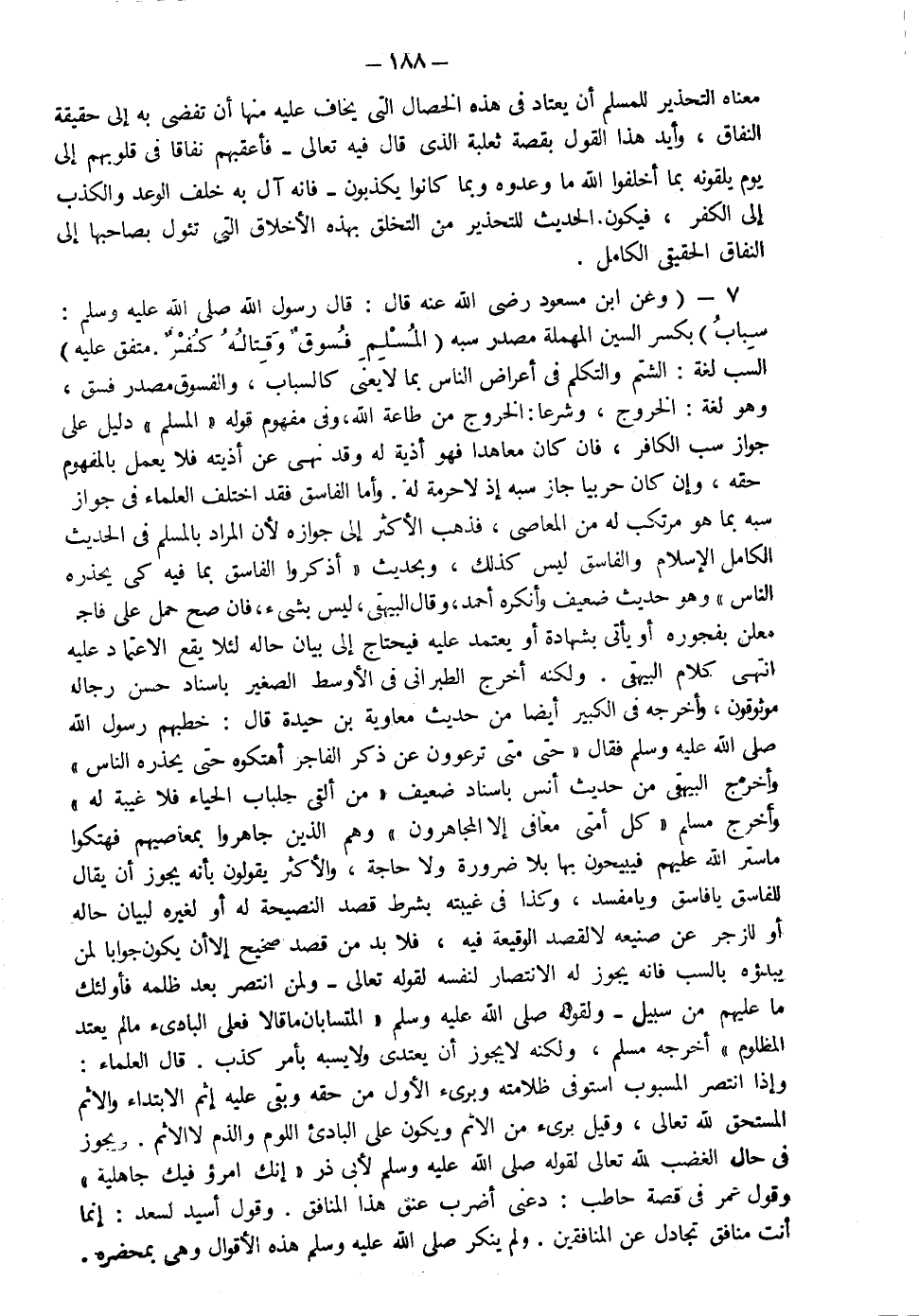 7- وعن ابن مسعود رضي الله عنه قال قال رسول الله صلى الله عليه وسلم: "سباب" بكسر السين المهملة مصدر سبه "المسلم فسوق وقتاله كفر" متفق عليه السب لغة الشتم والتكلم في أعراض الناس بما لا يعني كالسباب والفسوق مصدر فسق وهو لغة الخروج وشرعا الخروج من طاعة الله وفي مفهوم قوله المسلم دليل على جواز سب الكافر فإن كان معاهدا فهو أذية له وقد نهى عن أذيته فلا يعمل بالمفهوم في حقه وإن كان حربيا جاز سبه إذ لا حرمة له وأما الفاسق فقد اختلف العلماء في جواز سبه بما هو مرتكب له من المعاصي فذهب الأكثر إلى جوازه لأن المراد بالمسلم في الحديث الكامل الإسلام والفاسق ليس كذلك وبحديث اذكروا الفاسق بما فيه كي يحذره الناس وهو حديث ضعيف وأنكره أحمد وقال البيهقي ليس بشيء فإن صح حمل على فاجر معلن فجوره أو يأتي بشهادة أو يعتمد عليه فيحتاج إلى بيان حالة لئلا يقع الاعتماد عليه انتهى كلام البيهقي ولكنه أخرج الطبراني في الأوسط الصغير بإسناد حسن رجاله موثوقون وأخرجه في الكبير أيضا من حديث معاوية بن حيدة قال خطبهم رسول الله صلى الله عليه وسلم فقال حتى متى ترعوون عن ذكر الفاجر اهتكوه حتى يحذره الناس وأخرجه البيهقي من حديث أنس بإسناد ضعيف من ألقى جلباب الحياء فلا غيبة له وأخرج مسلم "كل أمتي معافى إلا المجاهرون" وهم الذين جاهروا بمعاصيهم فهتكوا ما ستر الله عليهم فيبيحون بها بلا ضرورة ولا حاجة والأكثر يقولون بأنه يجوز أن يقال للفاسق يا فاسق ويا مفسد وكذا في غيبته بشرط قصد النصيحة له أو لغيره بيان حاله أو للزجر عن صنيعه لا لقصد الوقيعة فيه فلا بد من قصد صحيح إلا أن يكون جوابا لمن يبدأه بالسب فإنه يجوز له الانتصار لنفسه لقوله تعالى: {وَلَمَنِ انْتَصَرَ بَعْدَ ظُلْمِهِ فَأُولَئِكَ مَا عَلَيْهِمْ مِنْ سَبِيلٍ} ولقوله صلى الله عليه وسلم: "المتسبان ما قالا فعلى البادي ما لم يعتد المظلوم" أخرجه مسلم ولكنه لا يجوز أن يعتدي ولا يسبه بأمر كذب قال العلماء: وإذا انتصر المسبوب استوفى ظلامته وبريء الأول من حقه وبقي عليه إثم الابتداء والإثم المستحق لله تعالى وقيل بريء من الإثم ويكون على البادي اللوم والذم لا الإثم ويجوز في حال الغضب لله تعالى لقوله صلى الله عليه وسلم لأبي ذر "إنك امرؤ فيك جاهلية" وقول عمر في قصة حاطب دعني أضرب عنق هذا المنافق وقول أسيد لسعد إنما أنت منافق تجادل عن المنافقين ولم ينكر صلى الله عليه وسلم هذه الأقوال وهي بمحضره